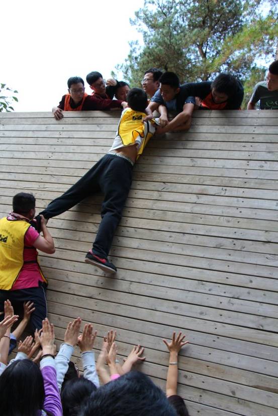 活动共分五个部分:破冰入营、共同进退、支援前线、鼓动人心、海难逃生墙。活动的高潮部分是海难逃生墙:42名教师在不能商讨且没有任何辅助物帮助的情况下,将每一位老师送至4.4米的高台,数次的失败并没有打消老师们团结协作的信心,最终取得了胜利。当最后一名老师被拉至高台时,所有的老师留下了感动的泪水......