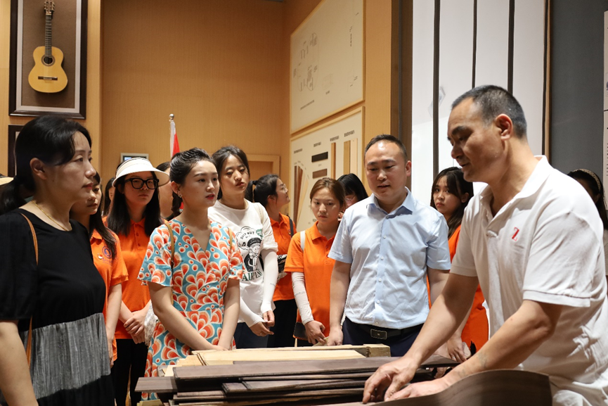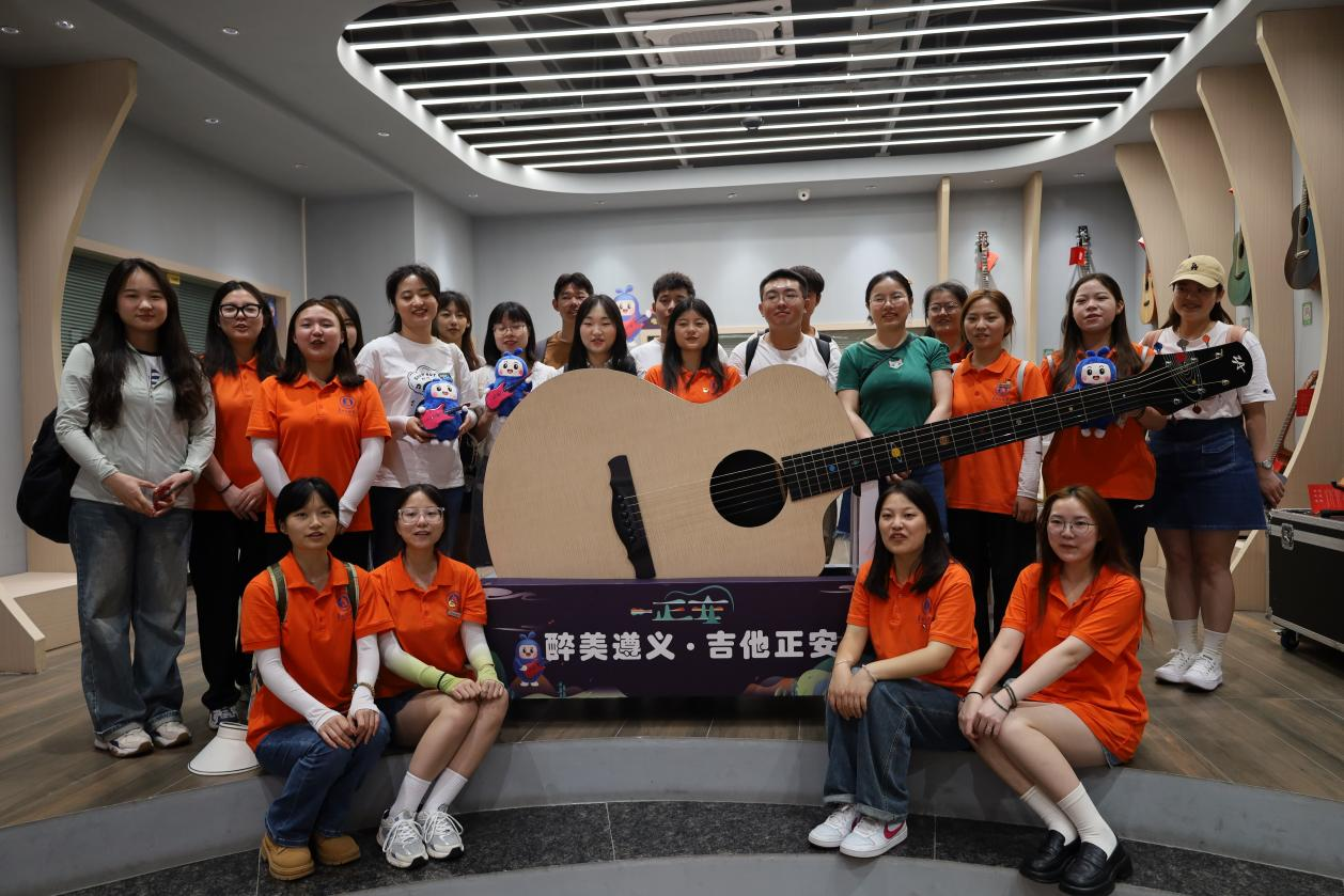正安吉他文化产业园(以下简称“园区”)是贵州省倾力打造的特色性、示范性园区。园区规划面积5.2平方公里,分为南北两区,南区为吉他文化旅游集聚区,北区是集吉他生产、研发、配套、物流、销售等产业链为一体的吉他文化产业装备区,也是本次参观的重点区域。进入园区后,首先映入眼帘的便是一句醒目的标语:“制作一把有生命的吉他,赋予每一把吉他以灵魂”,这或许就是一件没有生命力的乐器能在正安呈现生机与活力,成为每个“吉他人”的信仰,并不断延续发展的溯源。步入园区内景,在讲解员的介绍下,团队师生知晓了正安吉他产业发展的历史可以追溯至20世纪80年代,当时正安县组织三百名人员前往广东务工,工人们在当地吉他企业学到技术、积累资金后,毅然返回正安兴办吉他企业的故事,这也正是正安人学成归来,反哺乡里的时代典型,与东汉大儒尹珍先生学成反哺桑梓的事迹十分契合,在场同学无不受震撼与鼓舞。