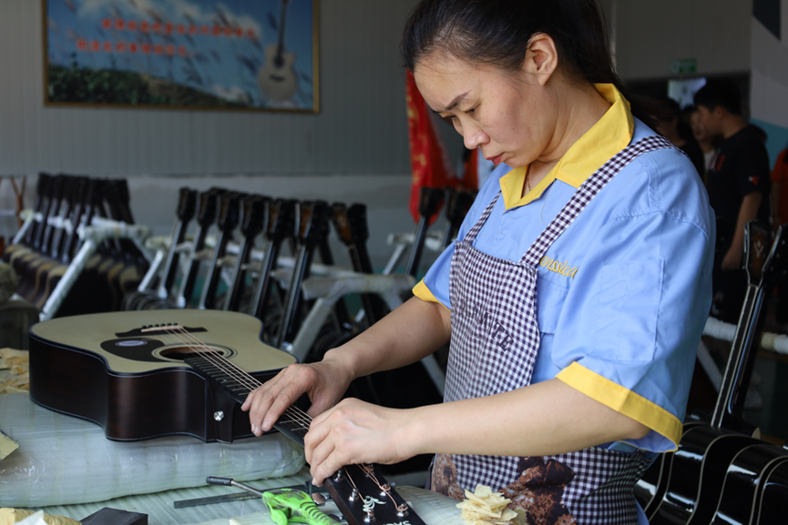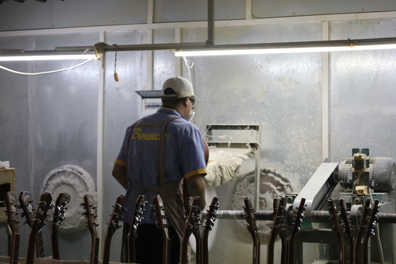 随后,大家前往吉他生产基地,现场观摩了吉他抛光、打孔、上漆、制弦等制造过程,看到工人们娴熟的操作、细心的复核、专业的调音,也终于明白为什么正安能在10年间,吉他制造及配套企业能实现从0到1的突破、从1到126的发展;为什么正安能年产吉他600万把,成为如今全球最集聚、最大的吉他生产基地的真正原因。最后,活动在观摩完正安自主研发、本土原创吉他品牌“娜塔莎”企业后圆满结束,全体同学合影留念并齐声高喊“娜塔莎加油,你一定会走向世界!”此举也向正安无数致力于从“制”造走向“智”造、从贴牌代工走向自创品牌的本土企业们呐喊、助力。