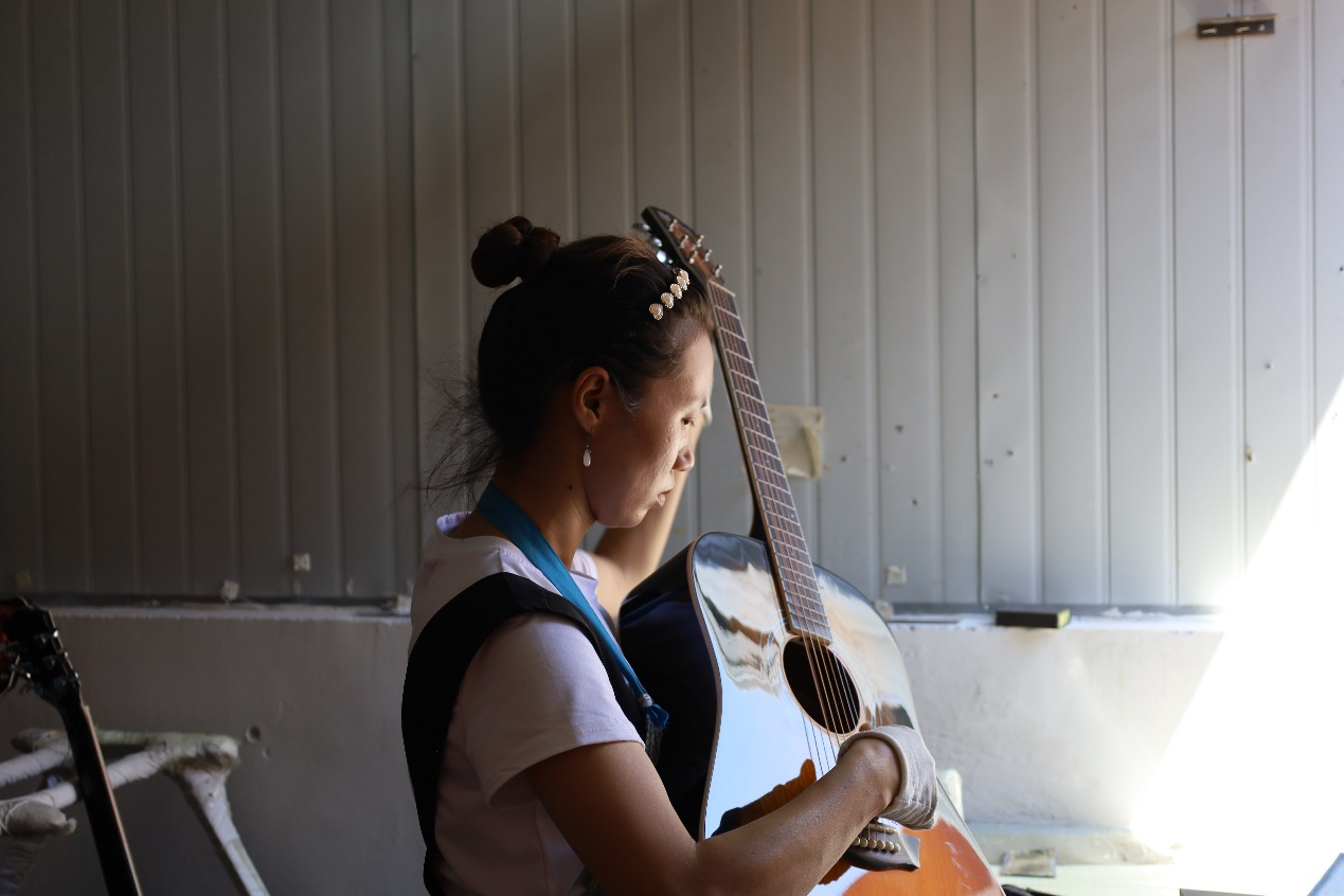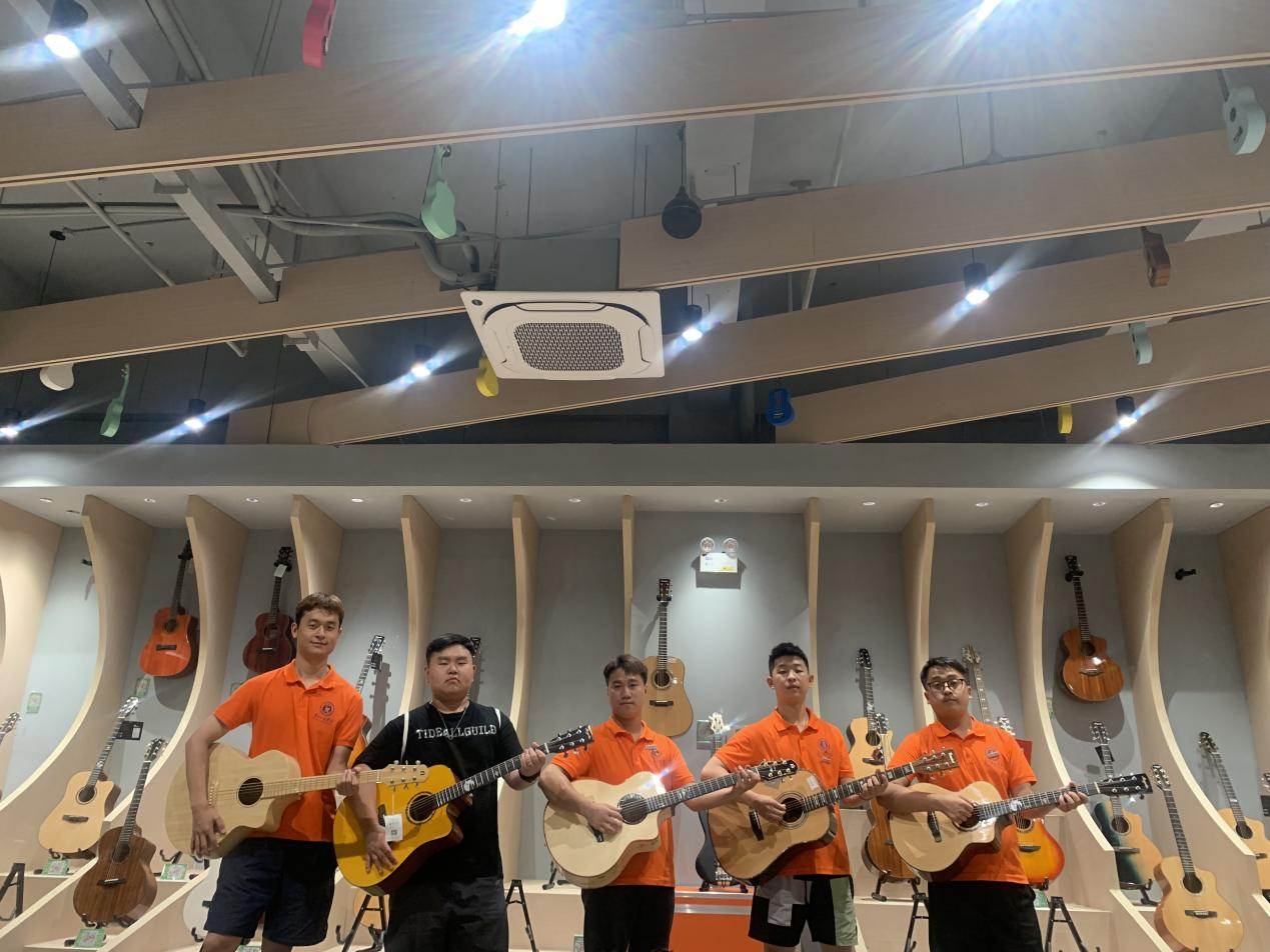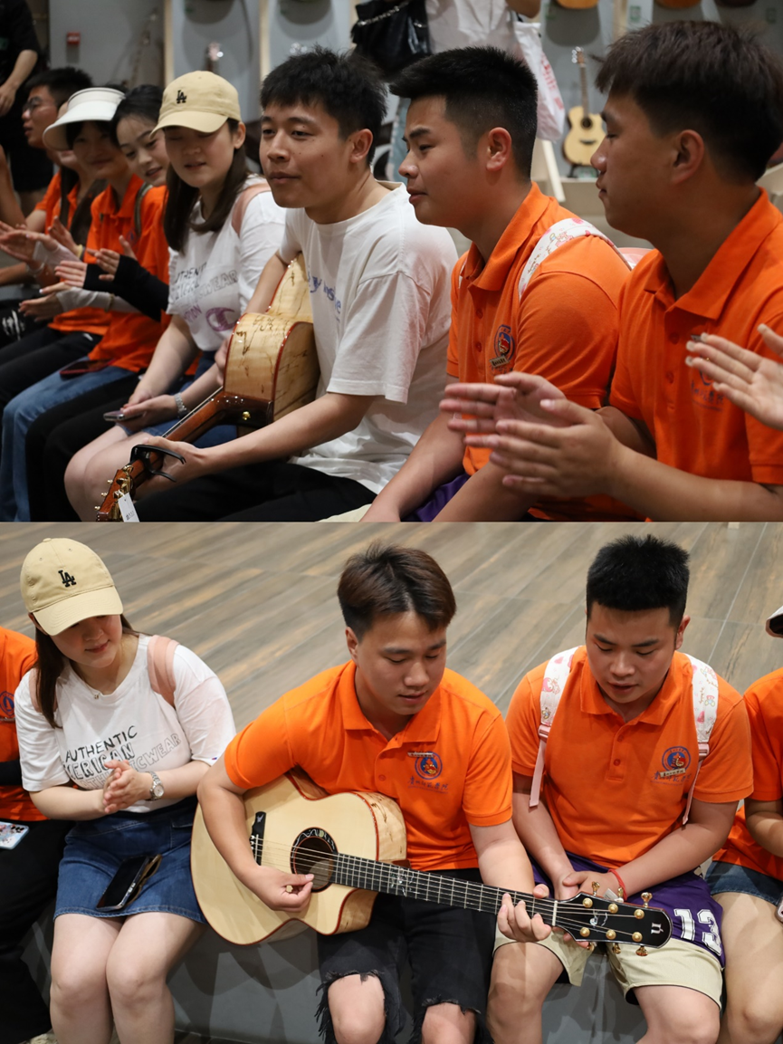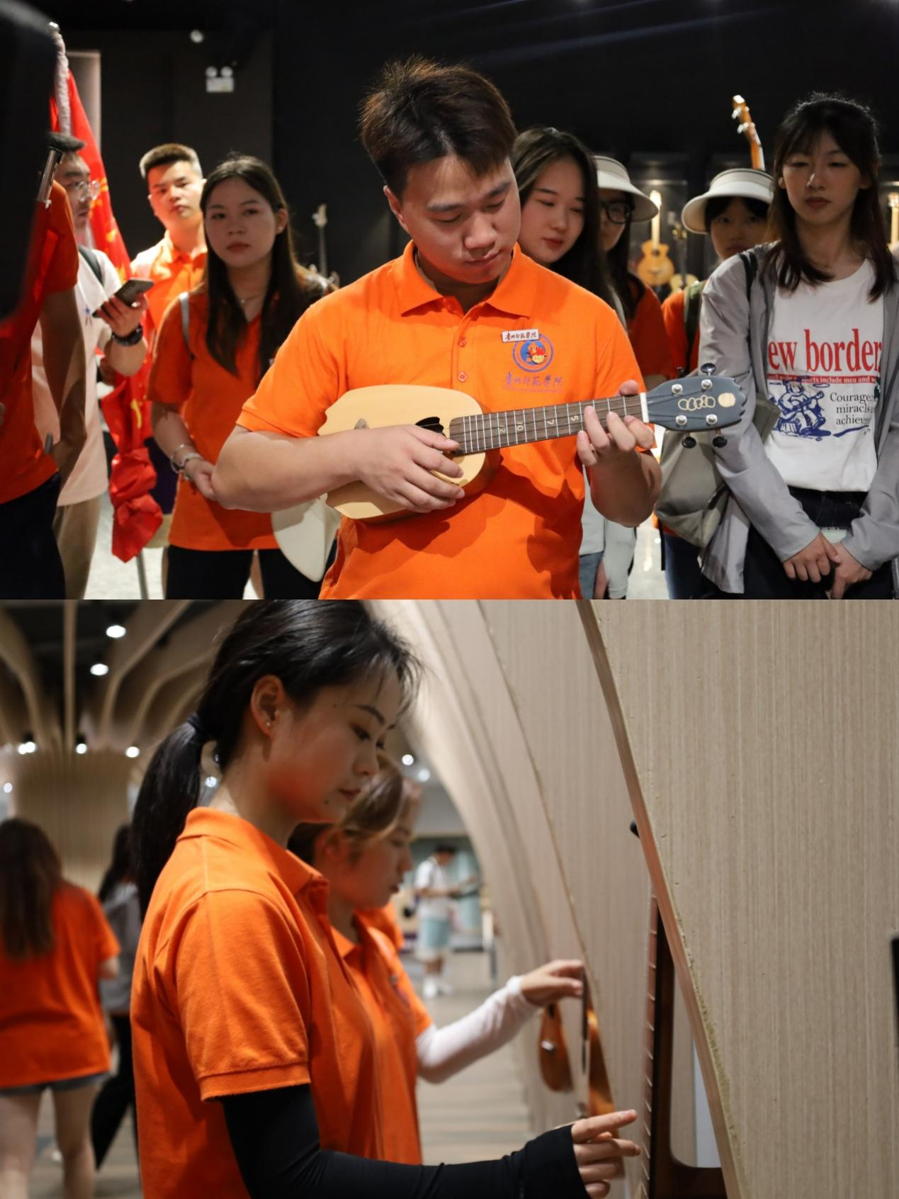 精心设计的场馆、华丽唯美的布局、用心雕琢的展区,处处彰显着建设者的细心、用心、诚心和善心。在此氛围下,公司音乐学专业本科生志愿者随即抱上吉他与贵大研究生哥哥姐姐们现场共同弹唱了《稻香》《再见》等脍炙人口的歌曲,“艺”同向正安“吉他精神”致敬。接下来,大家共同参观了张维义大师吉他工作室,并对张大师30年沉心俯身,用青春与热血致力于古典吉他制作与研究的“工匠精神”深表敬佩与折服,同学们纷纷表示也定会回归“工匠”初心,用奋斗锻造青春最美华章。
