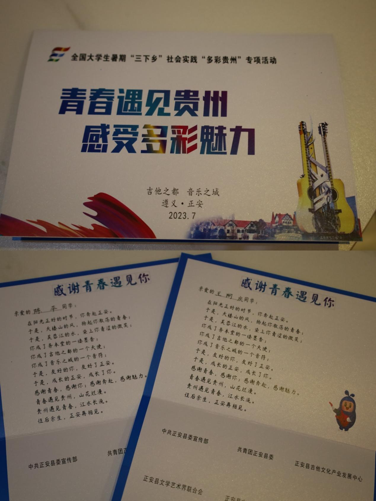 正安,这里有巨幅的吉他雕塑和吉他文化主题广场,路灯下、树影中都是跳动着的吉他和音符,处处沉浸着音乐的温馨氛围。以“艺”为媒,本次暑期“三下乡”活动开启了“爱乐之城”正安与音舞“有志青年”双向奔赴、彼此赋能的青春之旅。