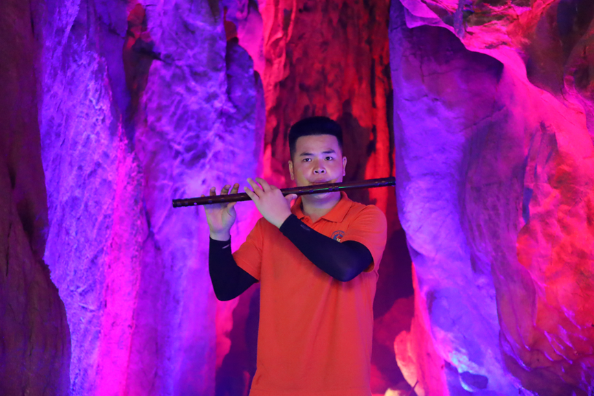 离开风雨桥,一阵凉风席面而来,团队师生步入桃花洞。桃花洞是典型的喀斯特地貌,洞高数十米,长约两百米,洞里或怪石嶙峋或水滴潺潺,并伴有石壁刻画。穿过长洞,豁然开朗,只见“土地平旷,屋舍俨然,有良田、美池、桑竹之属”,与《桃花源记》中记载得如出一辙,叫人叹为观止!