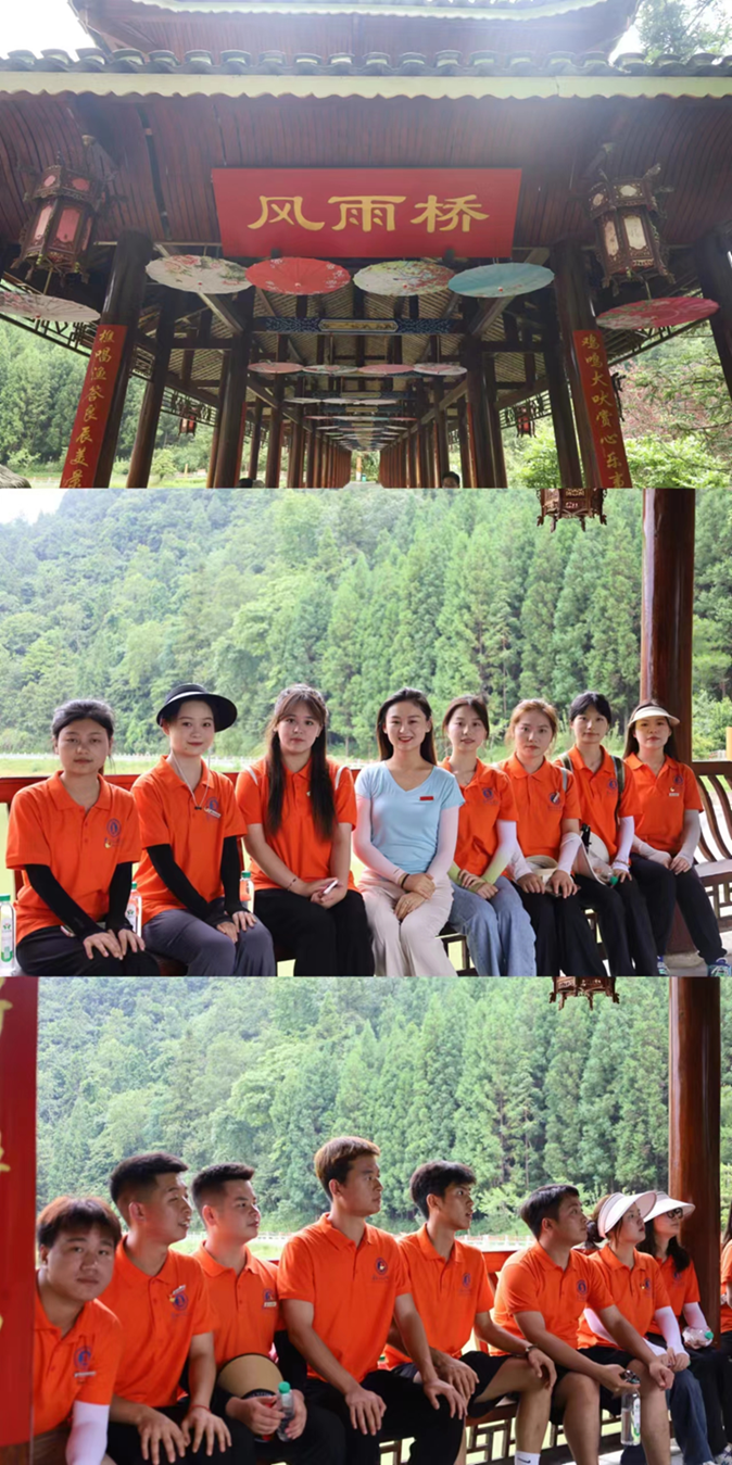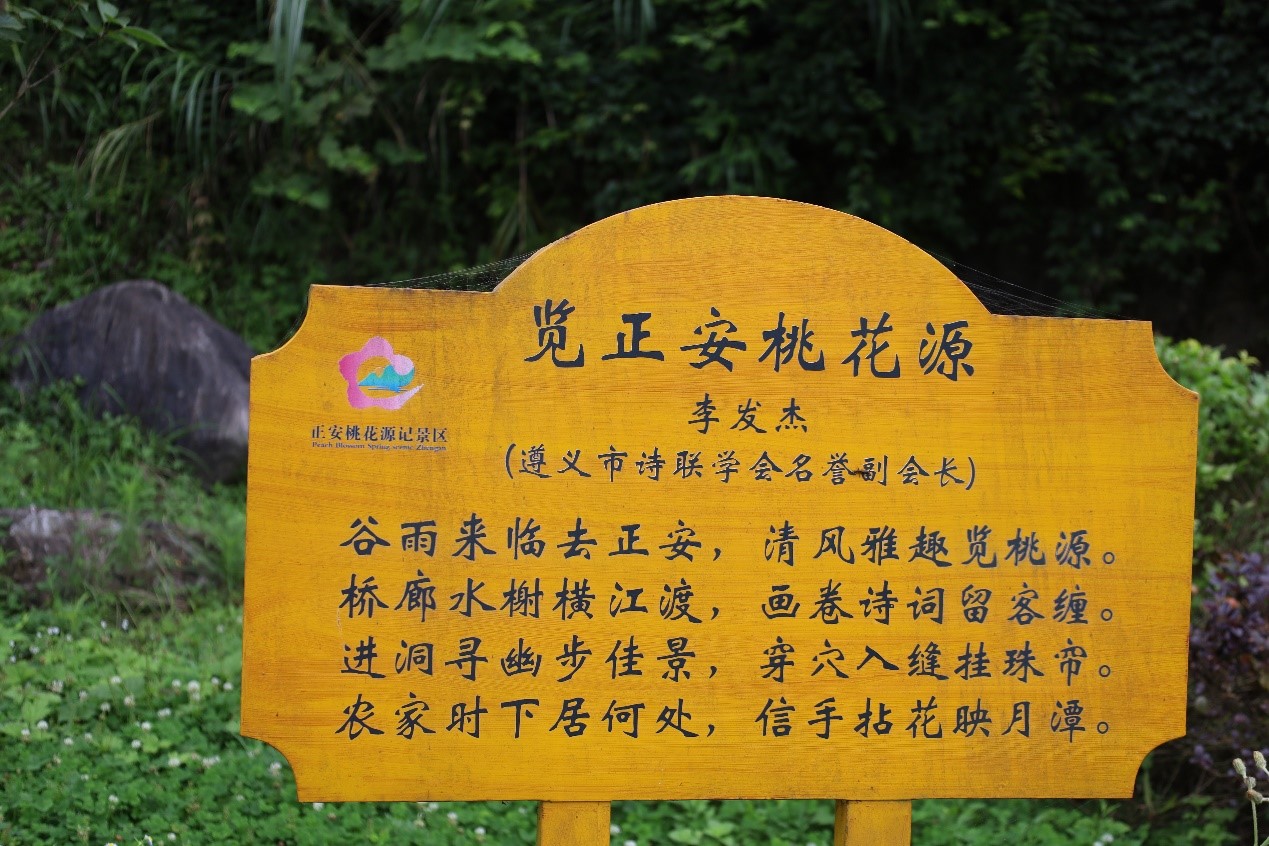 为进一步促进“大旅游”“大农业”的稳步发展,正安县市坪乡党委、政府把旅游业作为重要支柱产业,不断完善基础设施,依托“诗词之乡”建设,打造生成了集游桃花源记、尝苗乡美食、住特色客栈的“一站式”文旅服务体系。午饭后,在乡政府干部的带领下,团队师生一行28人抵达正安县市坪乡龙坪村桃花源记景区。初入胜地,便被牌匾上“一山两世界,一洞两重天”的绝美诗句深深吸引。走过郁郁葱葱的桃花林,路过一湾碧绿的桃花湖,伴随着“空山新雨后”的桃李香,大家穿越象征民族团结、寓意五谷丰登的风雨桥。休憩间隙,民间文化传承人罗淼为大家深情吟诗,动人讲述了桃花源记风景区的打造缘由,同学们仔细聆听、专心学习,深切感知乡村文化建设的发展成就。桃花源记景区作为正安县诗词创作基地,各文人骚客均在此留下美文绝句,加之得天独厚的天然条件,造就了如今集“颜值”“气质”为一体的“桃花源”。正如罗淼所说,每个人心中都有两个桃花源,一是陶渊明笔下的《桃花源》,而另一个便在眼前。