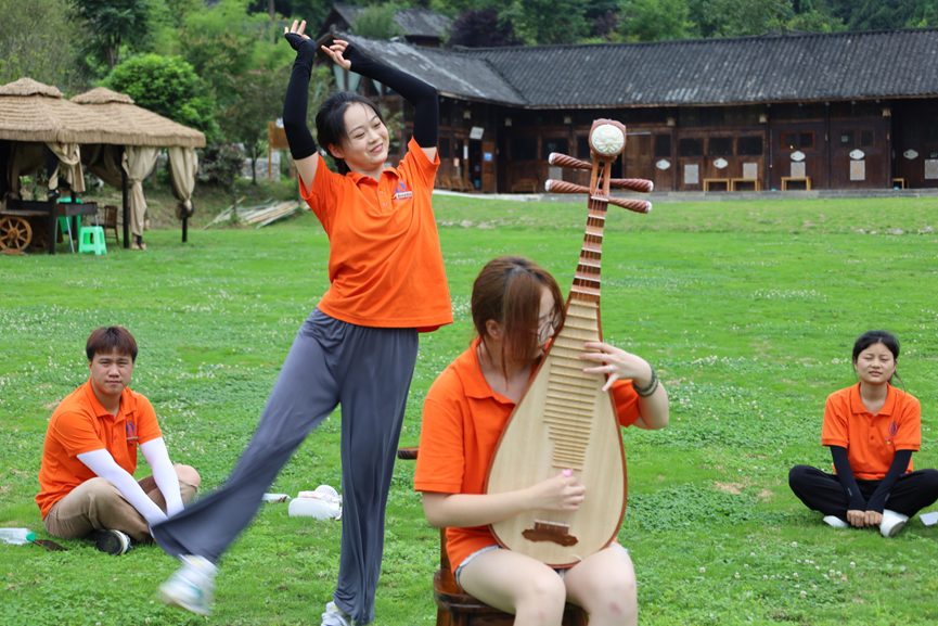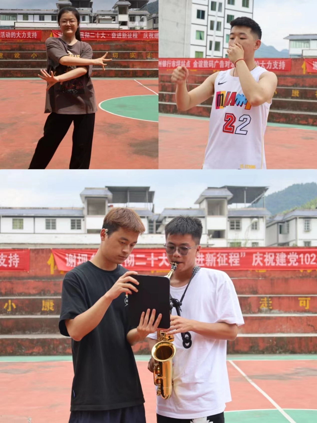 上午9时,“炫美阳光”志愿服务队的同学们在徐国杰老师的带领下到达谢坝乡中心广场,全力为15号在正安县吉他广场的晚会路演展开冲刺排练。三伏天骄阳似火,同学们不惧炎热,克服种种困难,全身心投入到节目排练中。为进一步丰富舞台表演形式,充实展演内容,呈现最好的舞台效果,大家不断创新表演载体、重组演绎方式,并努力将专业展示与党建、思政结合,致力于向正安县人民奉献一场文化育人的“大思政课”。