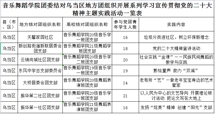 为深入学习宣传贯彻党的二十大精神,努力将全团思想和行动统一到党的二十大精神上来,把智慧和力量凝聚到完成党的二十大确定的各项任务中,更好团结引领广大青年紧跟党奋进新征程、夺取新胜利,在委的领导下,院团委主动作为,在员工思想政治教育上下功夫,以学习和践行二十大精神为导向,通过“院社联动、团团协作、支部结对、内外互嵌”的方式,与乌当区多个地方团组织达成结对共识,围绕二十大宣讲、生态文明建设、基层团建、支部共建、艺术赋能、创文提升、双减服务、五老关怀等内容开展系列社区实践计划和志愿服务活动,引导和帮助广大党团青年员工上好与社会实践相结合的大思政课,努力将williamhill英国官网员工党支部、各班级团支部建设成为全面贯彻党的教育方针、培养社会主义建设者和合格接班人的战斗堡垒。