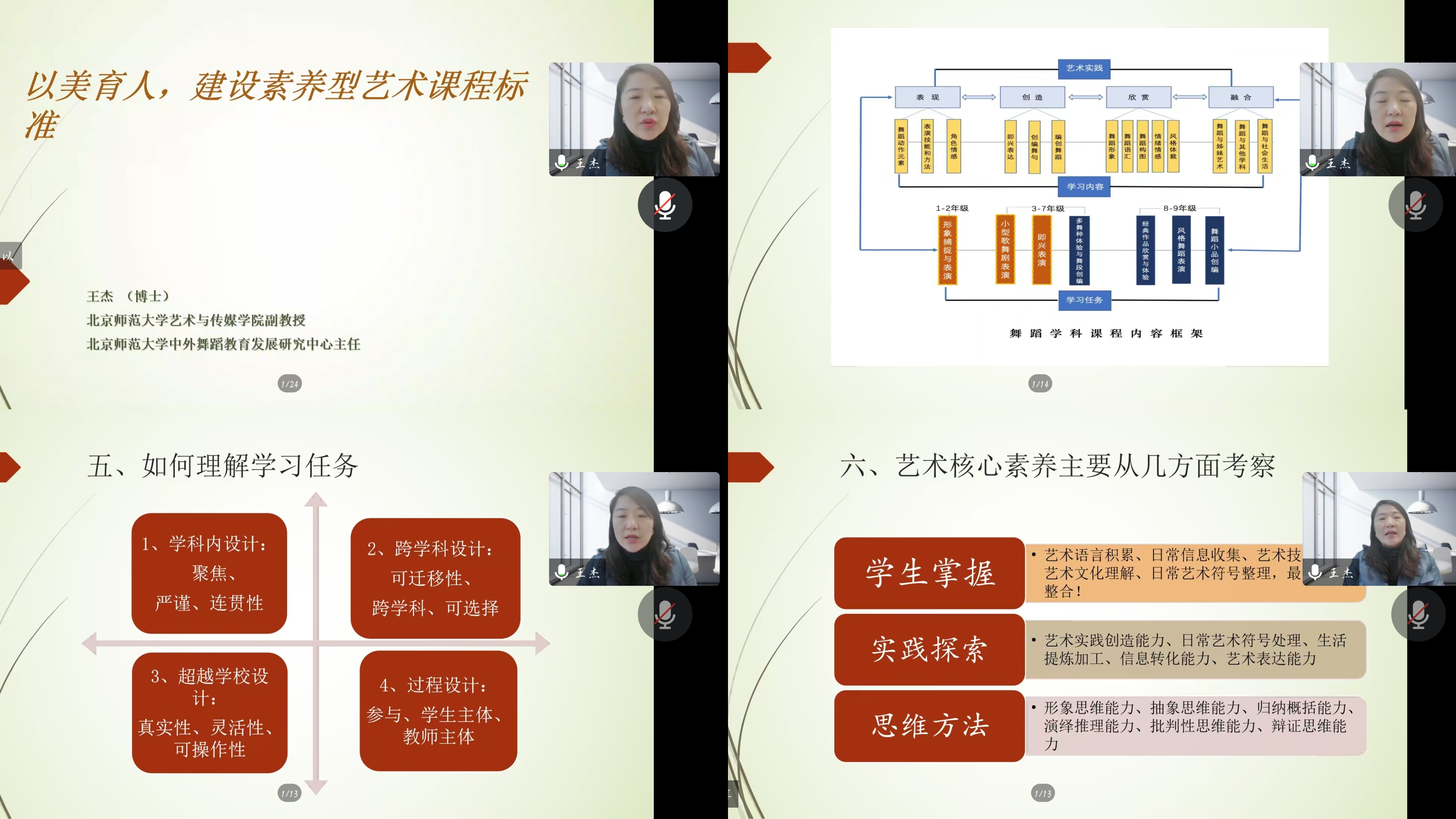 在讲座中,王杰博士提出建设素养型艺术课程标准就要以美育人、以美化人、以美培元。她分析了艺术核心素养的育人三大目标:“创新意识”“创新思维”“创造能力”,并围绕这三大目标进行了细致的讲解。王杰博士认为,实施美育教育要首先从理解课标,了解育人导向和国家政策入手,要让不同的舞蹈课程融入不同的领域。在开展美育过程中必须改革落后的公司产品方法。讲座最后,舞蹈系各位老师积极就开展美育的措施、路径等问题,积极地向王杰博士进行请教。