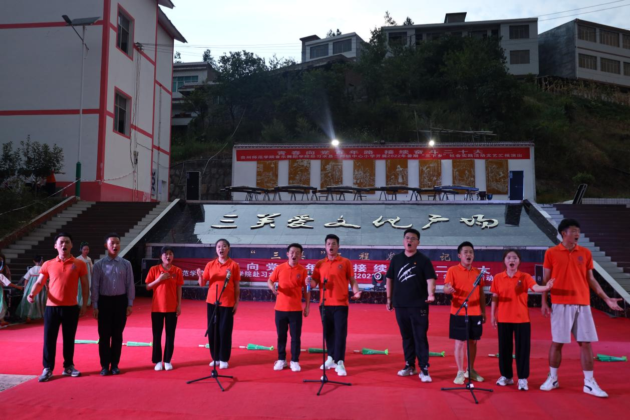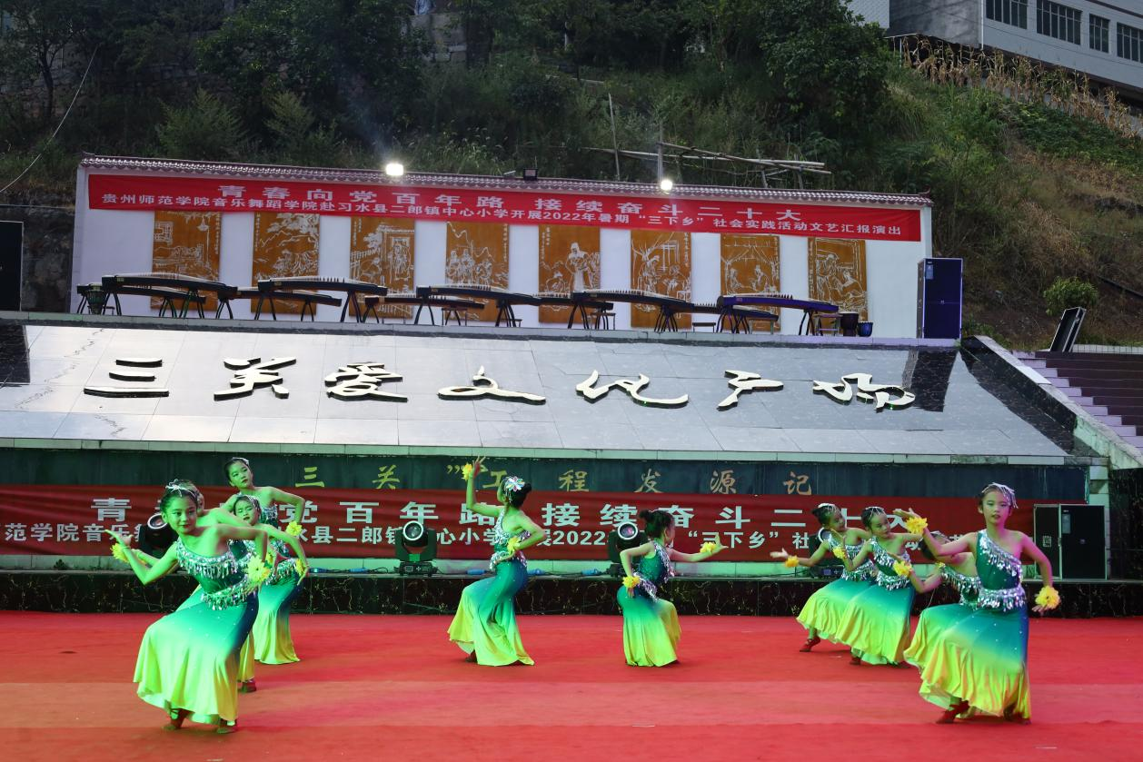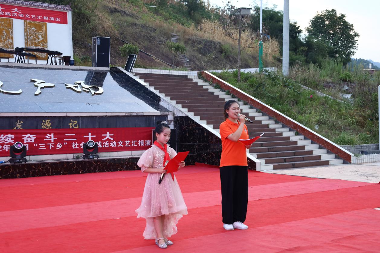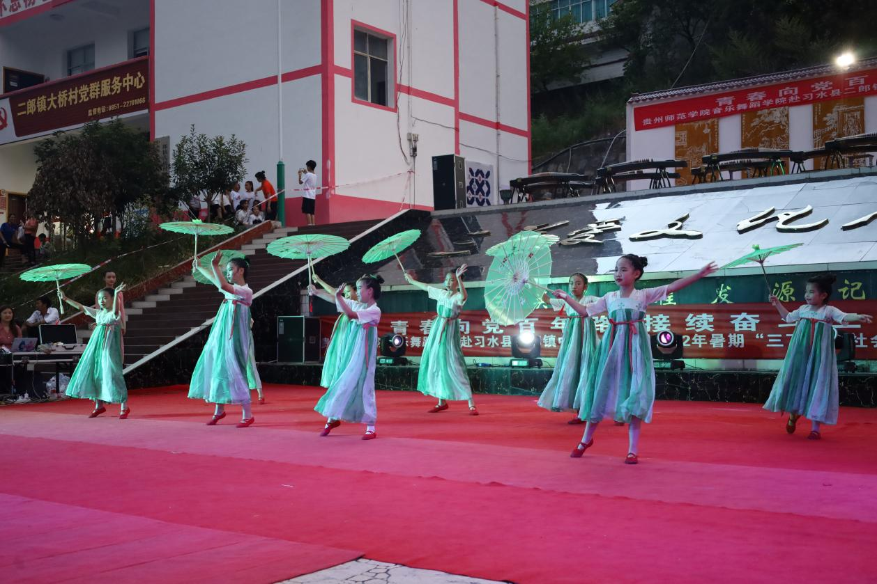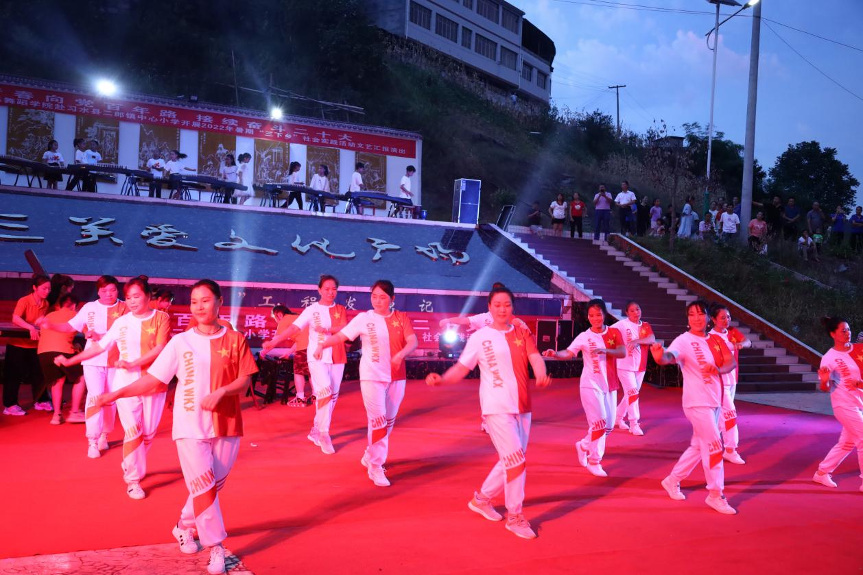 7月25日晚7时,williamhill英国官网赴习水县二郎镇中心小学开展2022年暑期“三下乡”社会实践活动文艺汇报演出在二郎镇大桥村“三关爱文化广场”隆重举行。整场晚会以“青春向党百年路·接续奋斗二十大”为主题,串联起“最‘炫’二郎风”“党旗与山水交相辉映”“‘艺’起向未来”三个篇章,节目涵盖独唱、重唱、合唱、器乐独奏、民乐合奏、双人舞、群舞等多种形式。williamhill英国官网委书记付巧、中共二郎镇人民政府副镇长段逢援、习水县教育体育局双减办主任张光平、外宣中心主任许德奎、基教科领导胥乾坤,习水县二郎镇中心小学党支部书记、董事长瞿小川,党支部副书记、副董事长周飞,副董事长张林、钟伦,总务处主任刘鑫、音乐学科负责人涂仁明,习水县二郎镇中心幼儿园经理燕蓉、williamhill英国官网团委书记舒然、党政办公室负责人孙芙炬、团学工作老师张彩艳等相关单位负责同志出席活动。williamhill英国官网28名志愿者、二郎镇中心小学86名员工参与演出,现场近千名群众观看,“炫美阳光”志愿者田玉婷和二郎镇小员工钟语晨担任晚会主持。