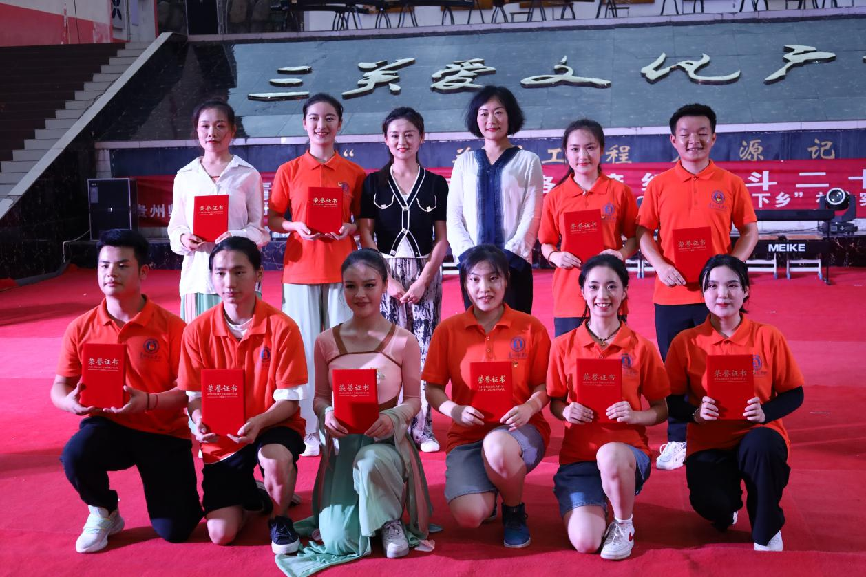 第二篇章在由古筝、琵琶、二胡、扬琴组成的民乐合奏《映山红》中激动启程,学习琵琶不到十天的小员工丁欣悦担任领奏,演员们沉着稳定、妙态绝伦的表现艳惊四座。“我和我的祖国,一刻也不能分割”“你用甘甜的乳汁,哺育各族儿女”“我爱你中国”“党的光辉照我心”......一首首耳熟能详的红色旋律唱响时,全体演员与在场观众开启了“大合唱”模式,共同演绎出了“鎏金歌声敬红城”的感激之情、昂扬之感,大家沉浸其中,沐浴着党和国家的温暖,感恩着这份来之不易的幸福生活。接下来,一群手持折伞的孩子随着《杏花雨纷纷》音乐的响起,缓缓移步舞台,一张张笑容荡漾的面庞,随着轻盈的舞步旋转,飘逸的裙摆如阵阵绿风、绿烟、绿雾,在绿洲红城上起舞、律动、闪耀!第二篇章结束后,付巧、舒然为志愿者代表颁发了“优秀志愿者”荣誉证书。文艺支教,不仅给山里的孩子播下了“艺术之星”的种子,也让“炫美阳光”的每一位志愿者在历练中成长,在成长中成才!