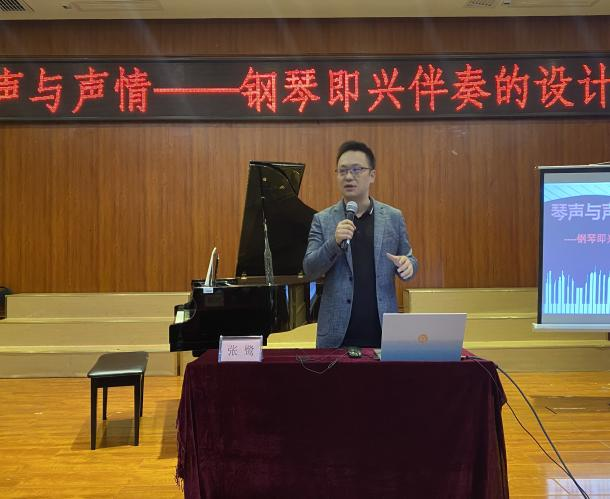 张老师首先对钢琴伴奏的理念进行讲解,并提出弹奏前要进行整体设计。随后以《渔光曲》为例子展开实践,包括了歌曲的基础和声设计、音型织体设计和演唱设计。张老师在实践中对上述的设计理念进行了一一讲解,并对不同的景物、人物和情感所需不同的织体设计进行描绘,使钢琴伴奏更加贴合歌曲本身的情感需要,并将演唱和伴奏更加谐和的融合在一起。