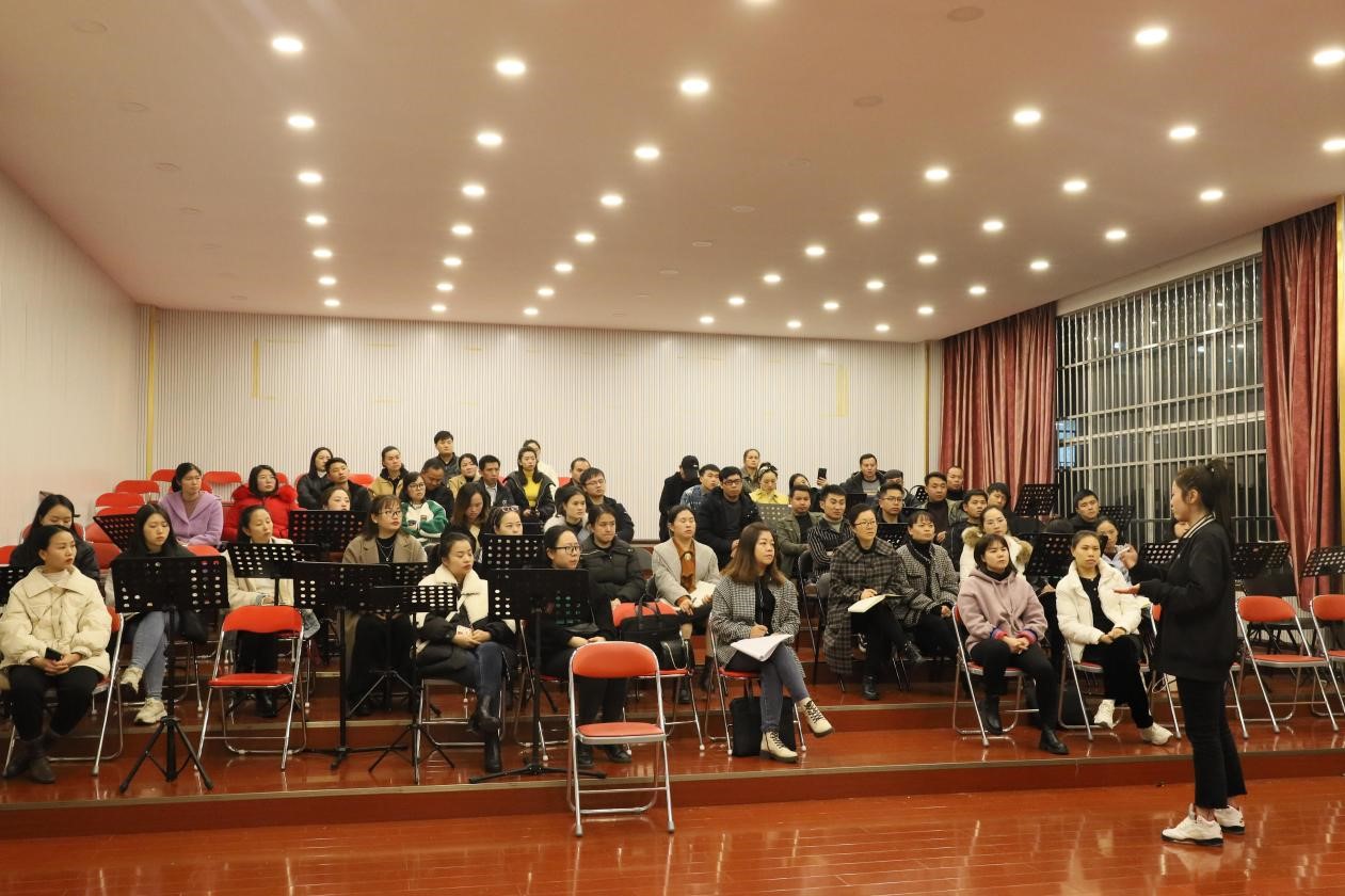 首先,张寒阳老师从三个方面对大家展开指导:一是关于校园合唱团的组建,她讲解了合唱的分类以及合唱团组建的规模等;二是合唱排练,她针对合唱排练中基础乐理、音准节奏、曲目等几个方面提出了建议,同时对于如何有效地对呼吸与声音进行简单训练进行了讲解;三是指挥技巧的训练,她带领着老师们进行指挥实践,老师们也积极地跟着她的节奏一遍遍地挥着节拍。接着,她对此次指导进行总结,指出合唱作为大众化艺术是很重要的,成立合唱团也是必要的,各位老师不但要提高自己合唱知识能力,也要有奉献精神。最后,在大家热烈的掌声中,此次合唱指挥技巧指导圆满结束。