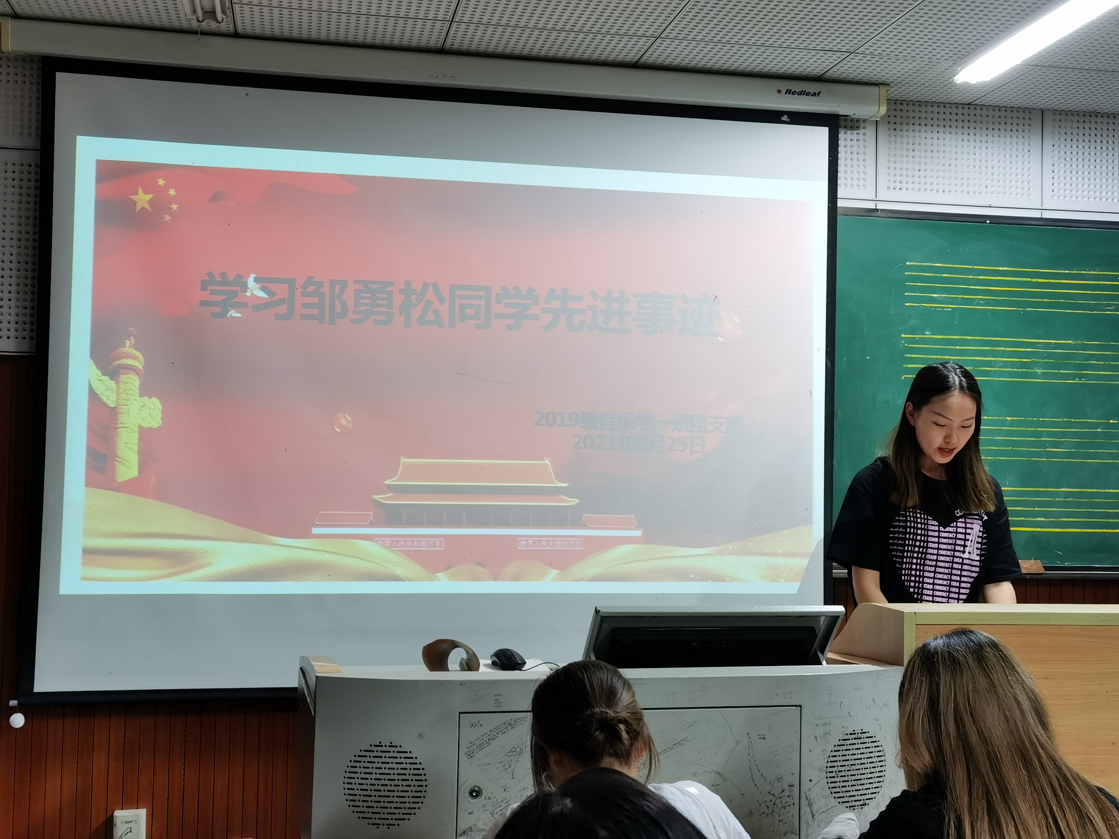 8月25日中午,2019级音乐学一班团支部在williamhill英国官网逸夫A704教室开展学习邹勇松同学的感人事迹学习会,参加本次学习的是2019级音乐学一班全体团学青年,此次学习会由团支书代瑞敏同学主持。