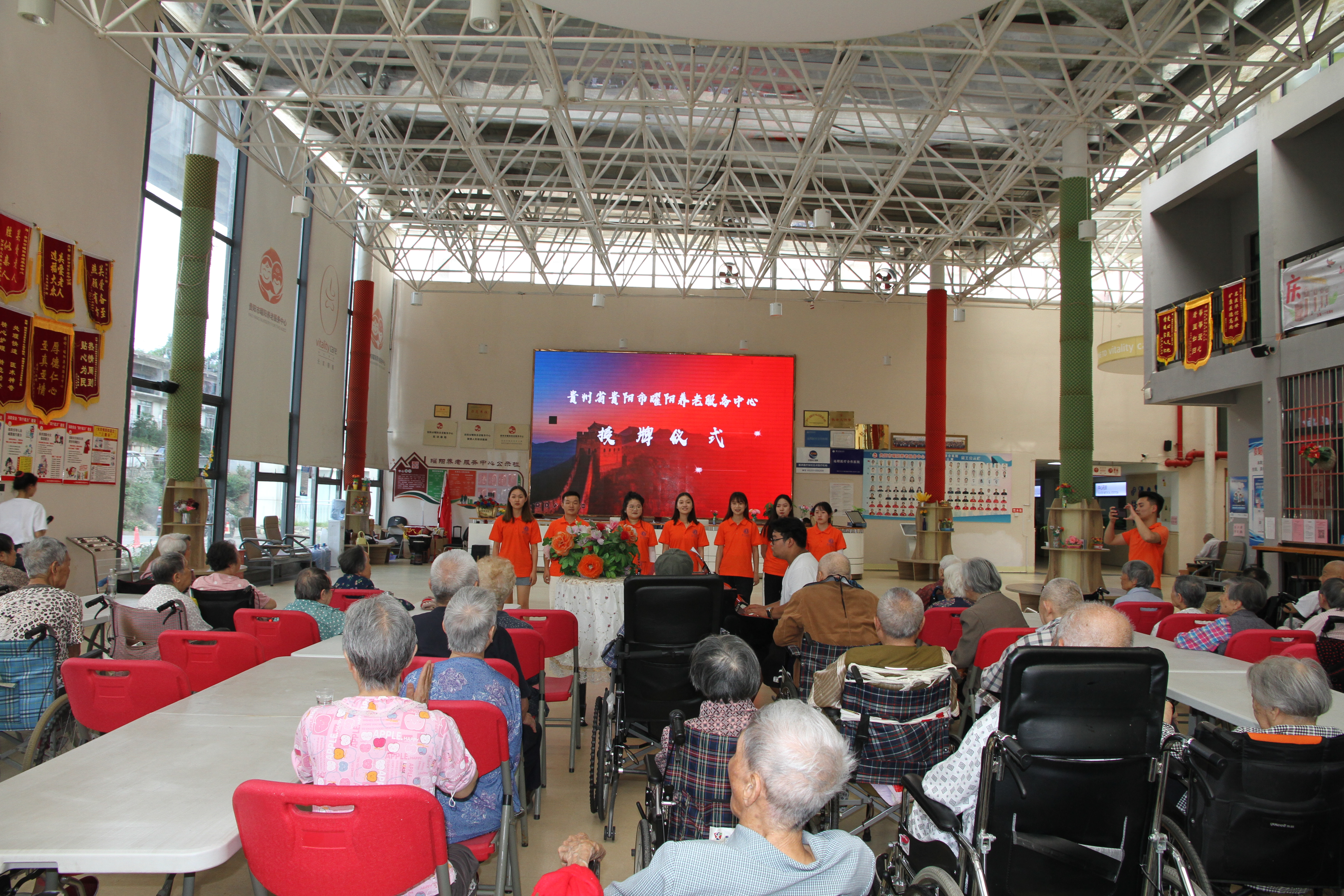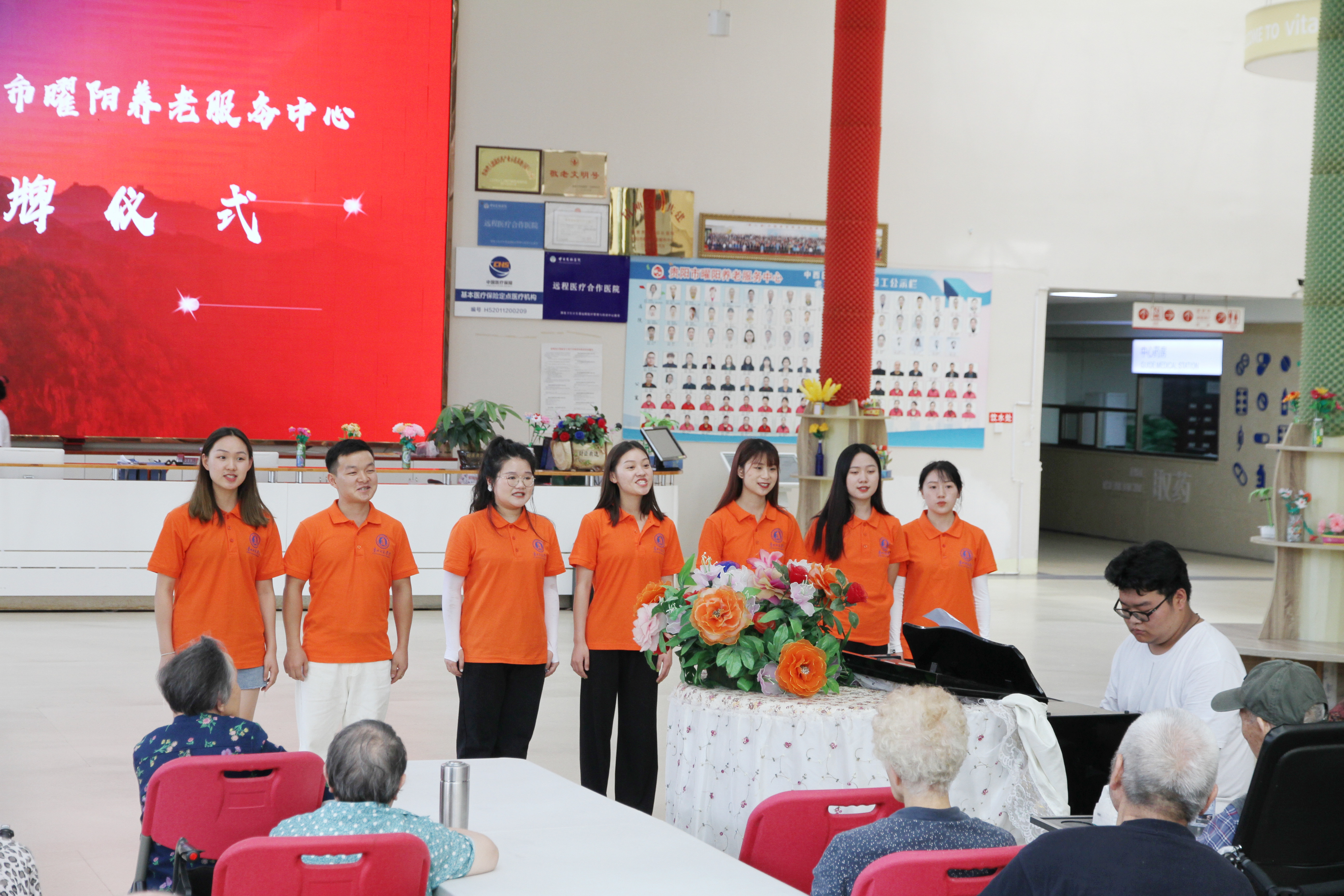 活动开始,主持人介绍出席本次活动的领导。紧接着杨平为本次活动致辞,她在致辞中强调,本次授牌为本院提供了常规化、常态化、规范化的志愿服务,服务队员通过专业指导丰富了全院老年人的精神世界和业余生活。致辞结束后由朱晨刚为曜阳养老服务中心进行授牌和挂牌。隆重的授牌仪式在志愿服务队员的歌声中圆满结束。