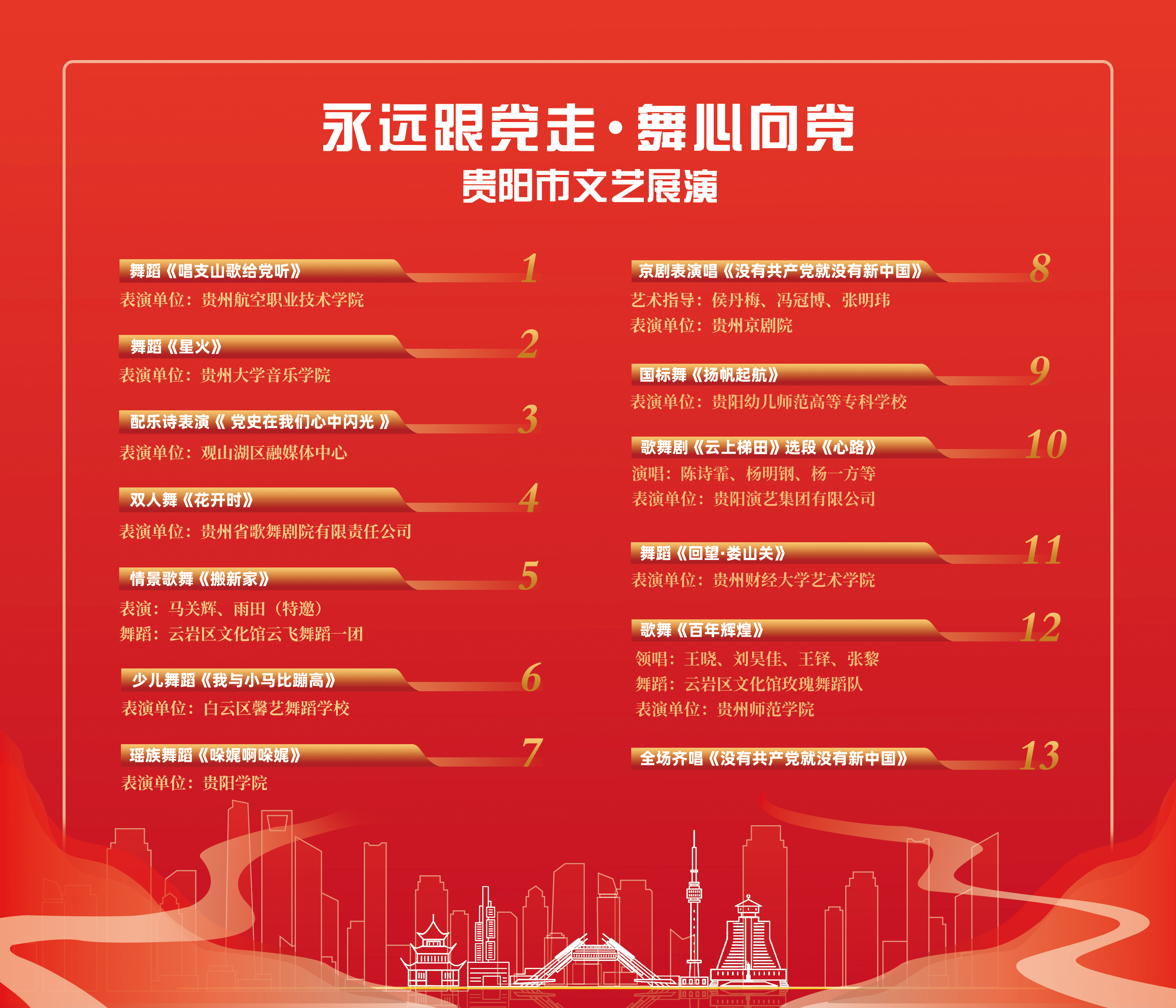 7月3日晚,由中共贵阳市委宣传部主办、贵阳市文学艺术界联合会承办,贵阳市舞蹈家协会、贵州京剧院、贵阳演艺集团执办的庆祝中国共产党成立100周年“永远跟党走·舞心向党”贵阳市文艺展演在贵州饭店国际会议中心举行。