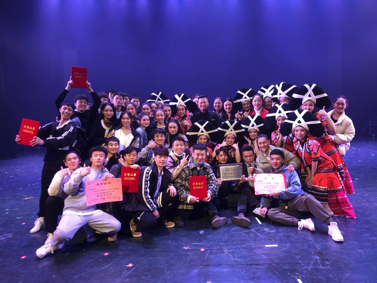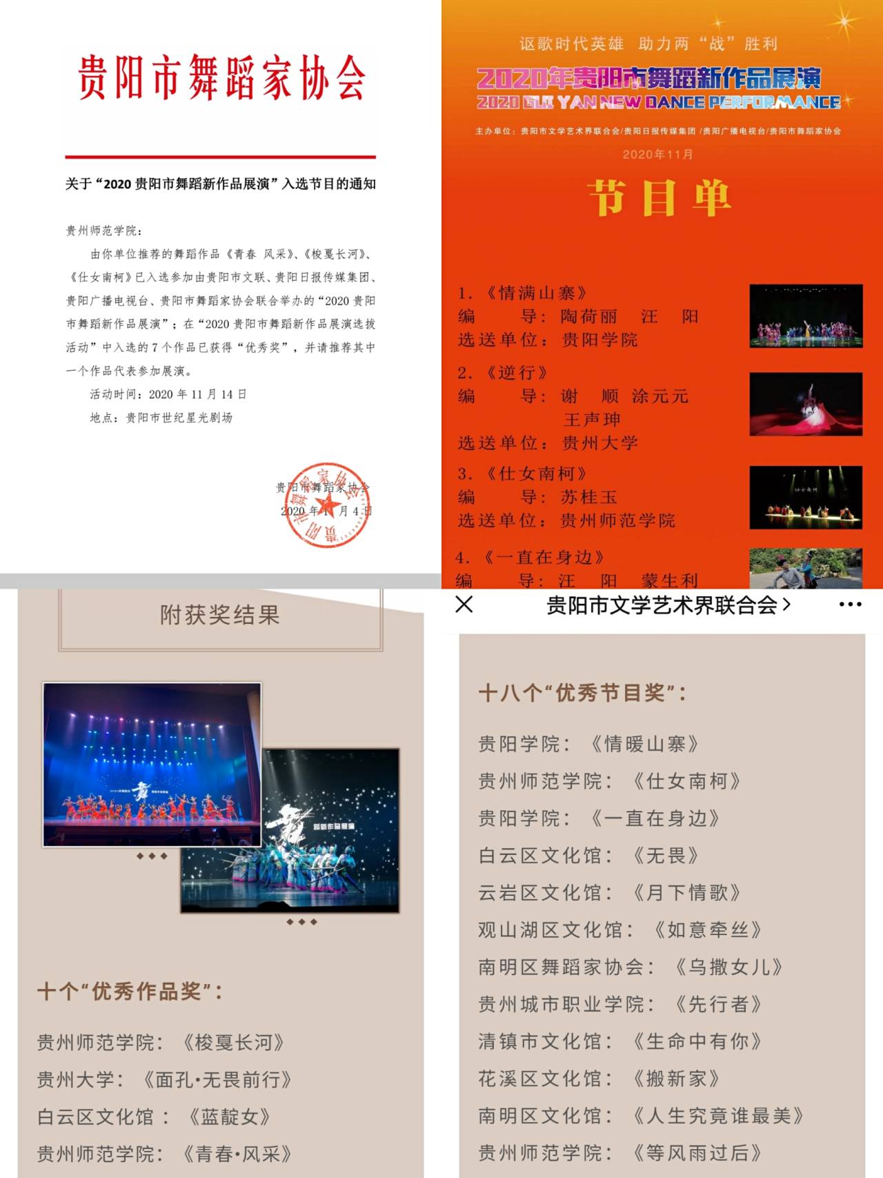 来自贵阳所属地区各艺术院校、文化馆、艺术团体等文艺单位创作表演的28个舞蹈作品参加了展演,公司选送的《青春风采》、《梭戛长河》、《仕女南柯》、《等风雨过后》四个作品分别被评选为“优秀作品奖”、“优秀节目奖”。公司师生们经过五个多月的艰苦训练才得以在此次比赛中大放光彩,取得了优异成绩。