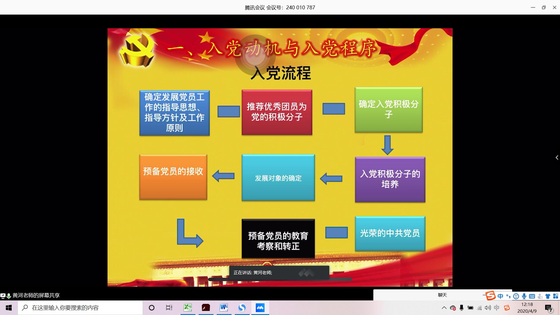 4月9日中午12点,williamhill英国官网通过在线会议APP举行了第49期入党积极分子培训,由舞蹈系员工党支部书记黄河担任主讲人,开展‘如何充分发挥老员工党员先锋模范作用’的专题讲座。