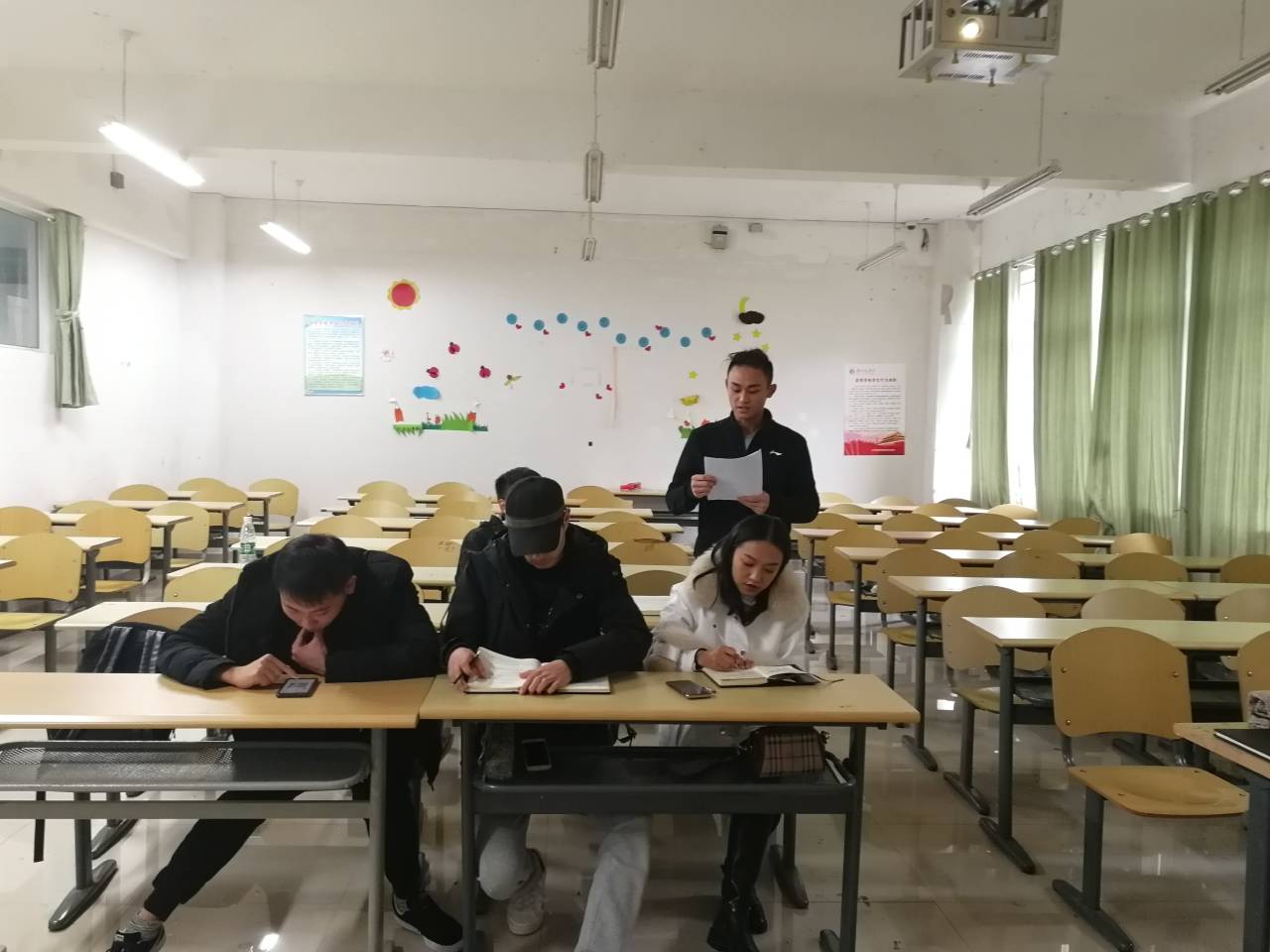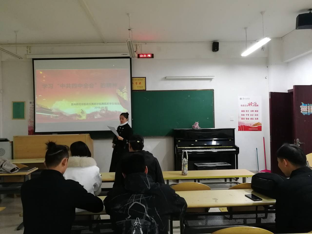 2019年11月20日中午,williamhill英国官网舞蹈系员工党支部在逸夫楼A409教室开展关于党的十九届四中全会精神的理论集中学习。舞蹈系员工党支部书记黄河、宣传委员郑小龙以及全体员工党员参与本次会议,罗鑫瑶担任主讲人。
