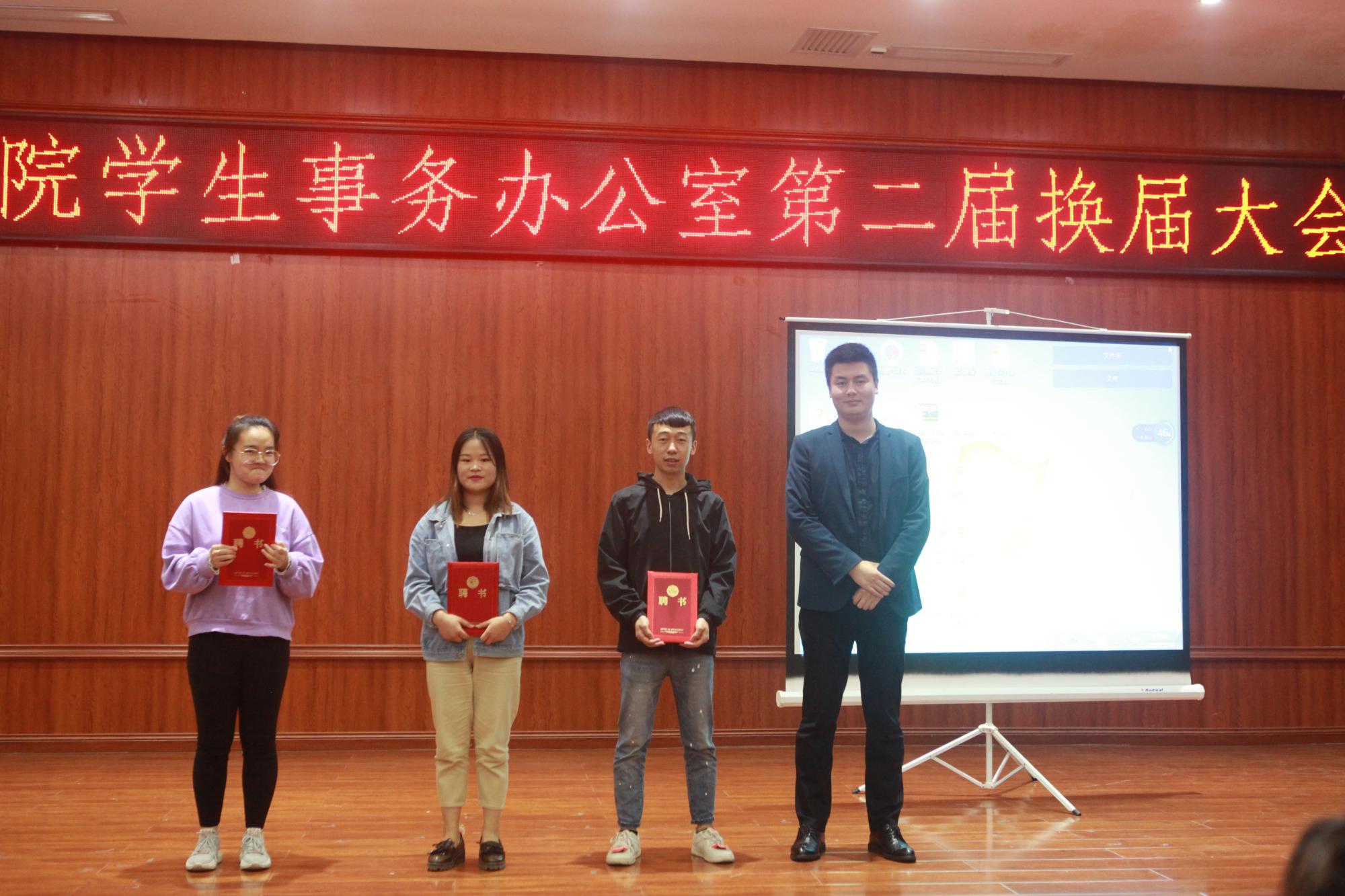 大会在主持人的致辞中拉开了序幕。首先,全体人员起立奏唱校歌。随即大会进入报告阶段,员工事务办公室上届主任贾庭就思想政治方面、工作服务方面等所取得的成就和存在的不足做了工作总结,充分肯定了上一届工作的同时对新一届干部成员的工作要求,做出了展望,也表达了对老师和同学们的感谢。接着,员工事务办公室第一届主任曾垂会发言,他就员工事务办公室成立最初到今的状况做了演讲。紧接着由程呈老师宣读了员工事务办公室换届任命文件,随后新一届主任及各部门部长代表发言,表明了自己的认真工作态度以及对办公室美好未来的期待。此时播放了一段由部门大一的学弟学妹对老师以及学长学姐表达感谢的视频。会议最后,程呈老师、王铎老师,张寒阳老师为上一届员工事务办公室主任、副主任、各部门部长及副部长颁发了聘书。并对大会作了最后的总结,对他们一年来付出的努力及对公司建设做出的贡献表达了肯定,并祝愿员工事务办公室越来越好。