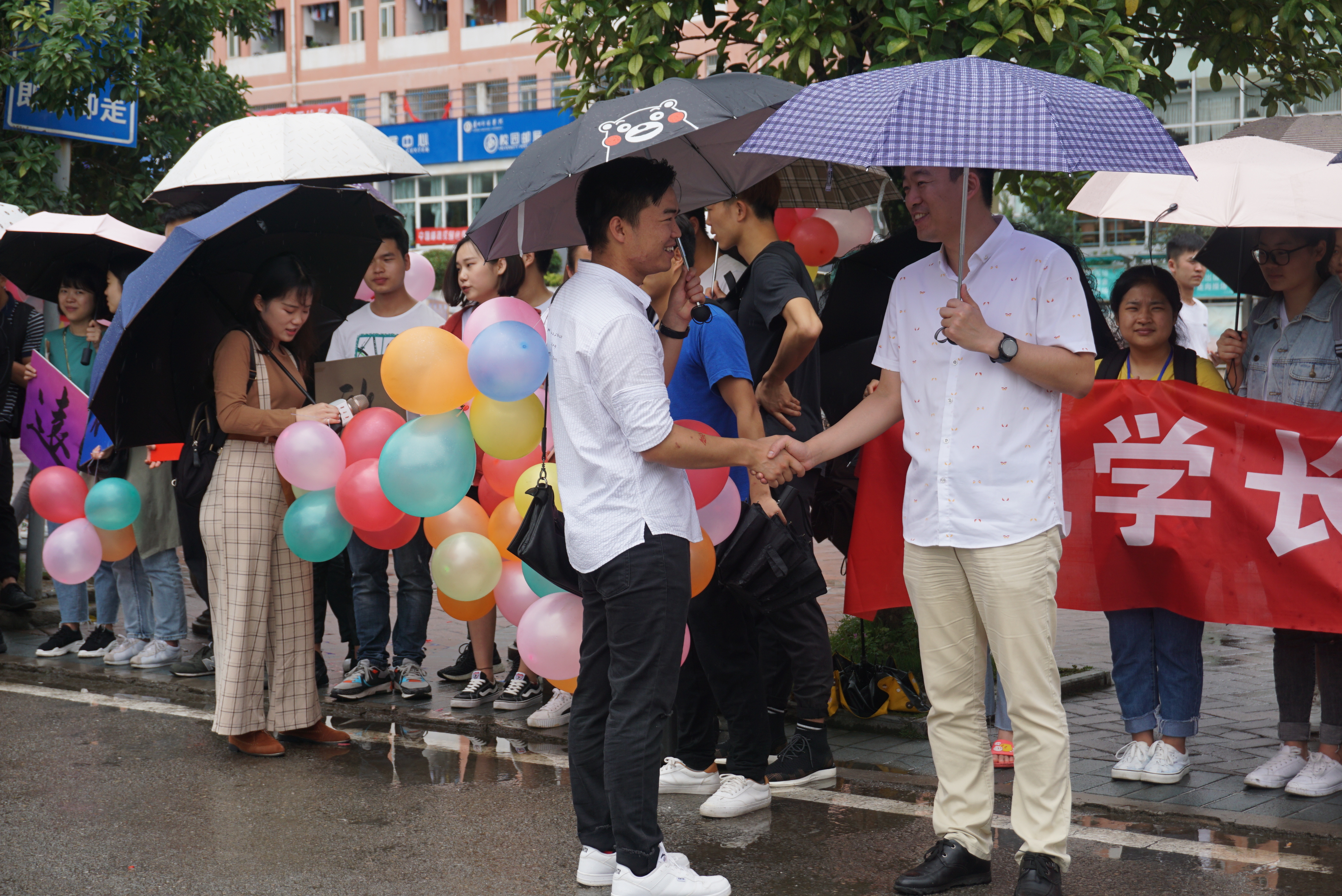 绵绵细雨,伴随歌声,支委同学大清早就开始准备相关工作。搬音响、打气球、绘图......一切准备就绪,大家集合一起出发,前往送别之程。员工党员带领广大同学一路放着轻快的歌曲抵达奋斗广场,有序的整队集合,高举院牌、挥舞院旗,高喊:我们相亲相爱,我们永远在一起!