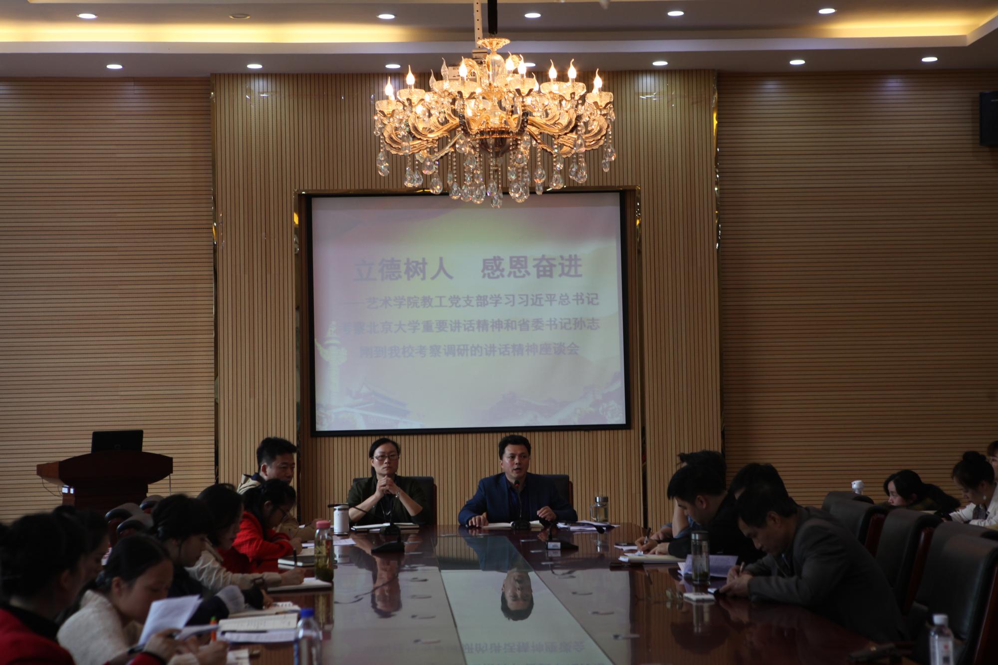 5月16日,艺术公司全体教职工在会议室召开专题研讨会。研讨会以“‘吐辞为经、举足为法’,争做员工健康成长的引路人”为主题,紧紧围绕习近平总书记在北京大学师生座谈会上的讲话精神和省委孙志刚书记到公司视察的讲话精神展开。研讨会由教工党支部书记陈玉莲主持。