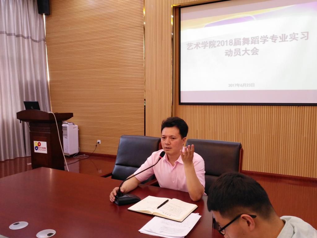 马关辉对此次员工集中实习作出讲话,他强调了此次实习成果在毕业汇演中的重要性,实习成就也将会是一个绚丽的亮点,毕业汇演的场所会从校园演播厅转变到外场的大型汇演中心,为实习生们提供一个青春闪亮的舞台。马关辉指出:“台上一分钟,台下十年功,同学们要想在舞台上脱颖而出,就必须分秒必争”。紧接着,舞蹈学科主任肖伟就实习指导、毕业晚会安排、实习中的各项事宜等作出了规定安排。