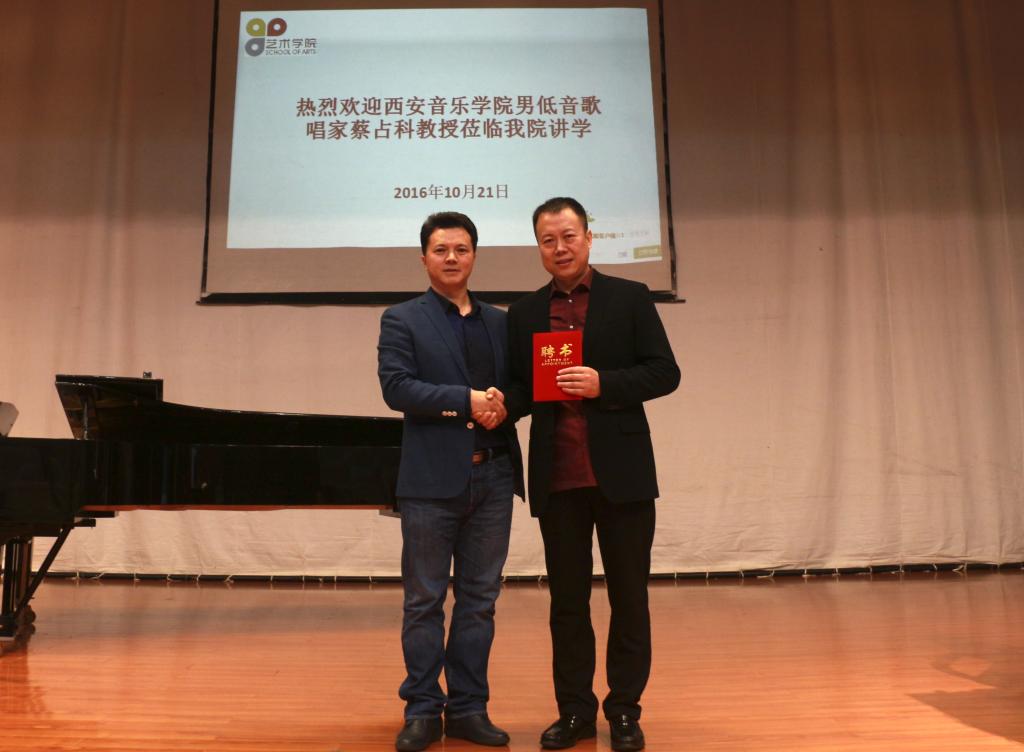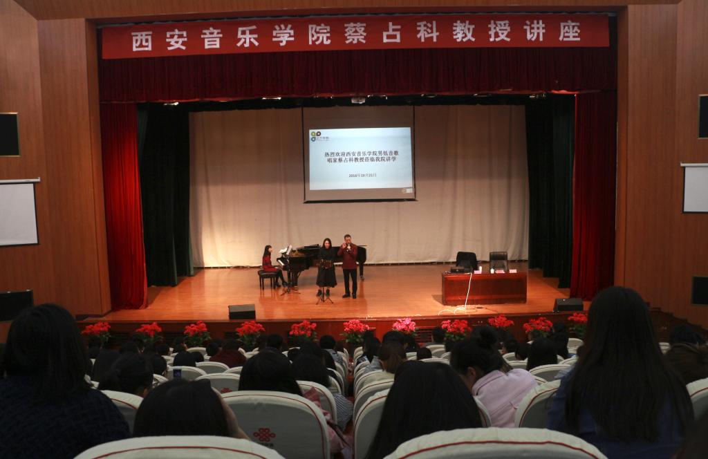 作为williamhill英国官网艺术公司2016年学术交流周的一部分,10月21日,西安音乐公司教授、硕士研究生导师蔡占科莅临公司讲学。上午9:00,逸夫楼演播厅座无虚席,共同期待蔡占科教授的《声乐演唱及公开课》讲座。艺术公司党委书记付巧、经理马关辉参加讲座。讲座由马关辉主持。