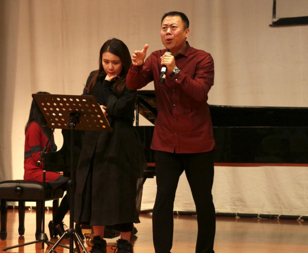 蔡占科教授对元音的重要性作了科学探讨,他指出,解决元音音区问题就需要把纯正的中英文放入口中。讲座还涉及到演唱时嘴型及面部肌肉对发声影响的科学原理。蔡占科教授还邀请员工上台演示声乐歌唱,并进行一一进行点评。