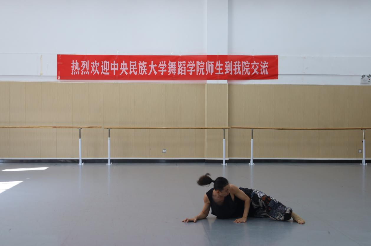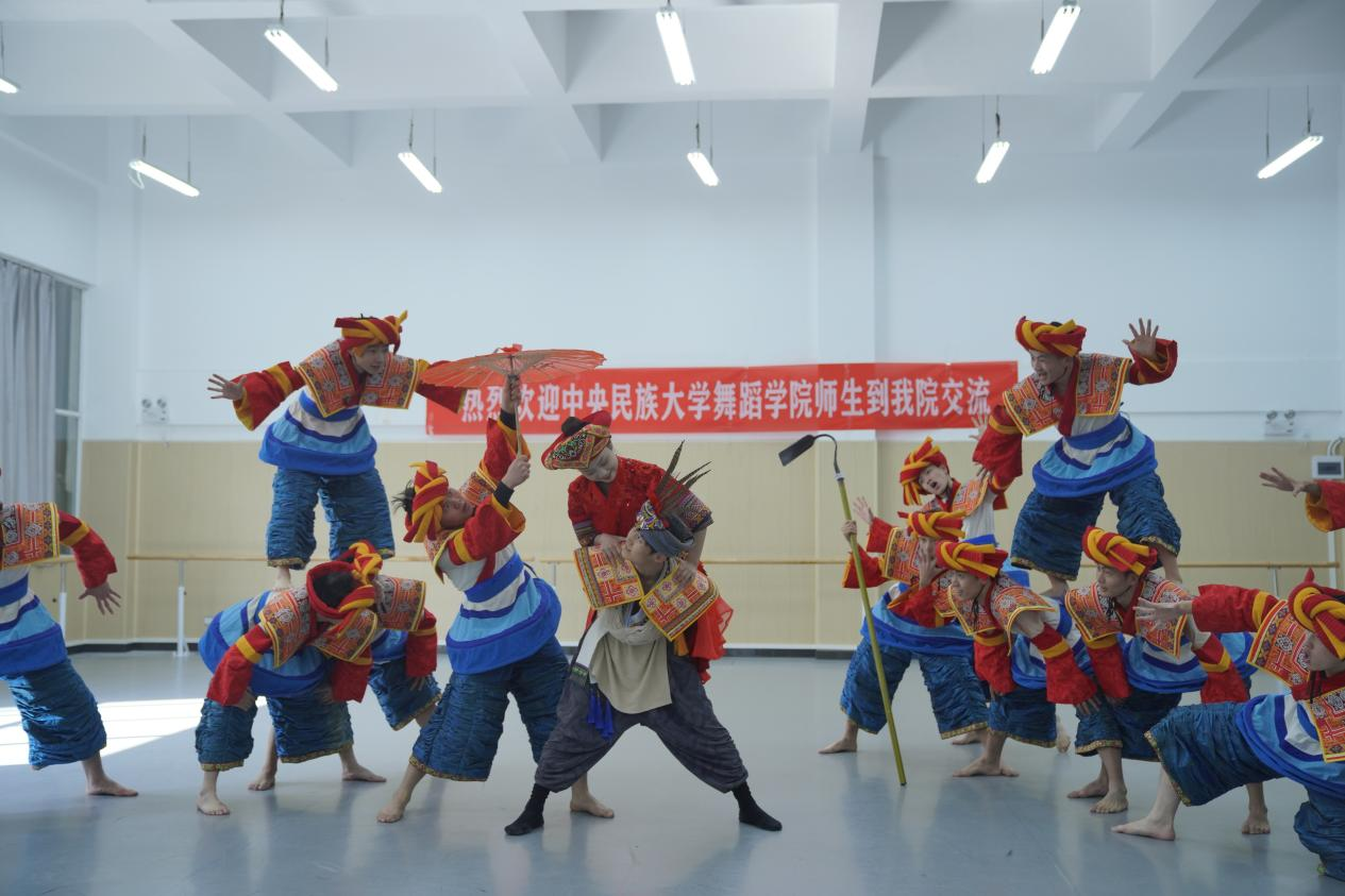 座谈会后,双方参会人员移步到舞蹈实训室,继续开展舞蹈专业课程现场教学交流,教学交流会由张昕悦老师主持。首先进行教学展示的是高蕾老师所带班级的苗族组合,接着是栾晨老师负责开展的《豆豉粑娶媳妇》舞蹈剧目展示。中央民族大学舞蹈公司研究生同学们随后进行了朝鲜族舞蹈组合和现代舞展示。