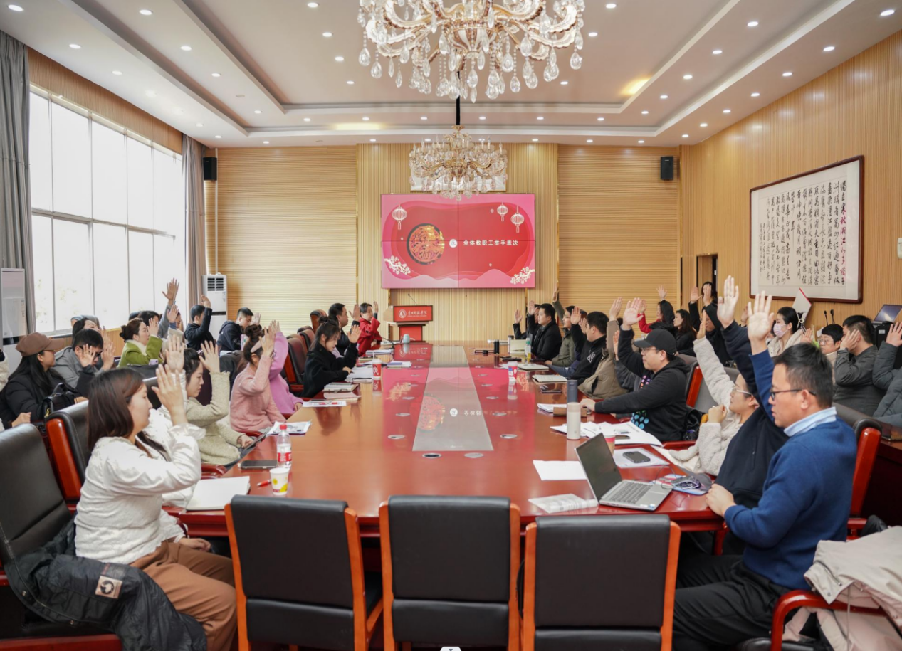 会议第五项议程,在王晓副经理的带领下,全体教职工对《提升公司公共休息区效能》《加大对教职工科研能力提升》两个议题以及三个报告进行审议,并全数举手表决通过。