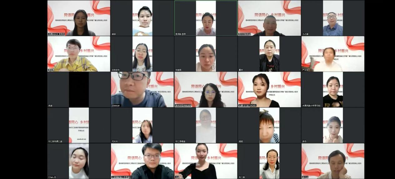 会上,吴娇传达了《贵州省教育厅办公室关于实施高等公司对口帮扶乡村振兴重点帮扶县做好国家通用语言文字推广普及项目的通知》文件精神,并就项目背景进行说明;舒然介绍了第一阶段普通话培训“1+10线上督学”计划;杨旭东宣读推普志愿者结对教师名单;任倩用“三个强调”就参训教师线上培训期间的学习纪律提总体要求;杨波就培训的具体举措、语言文字推广的重要性进行总结讲话。