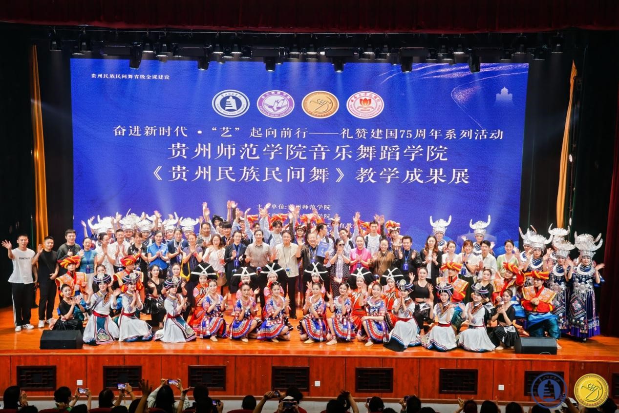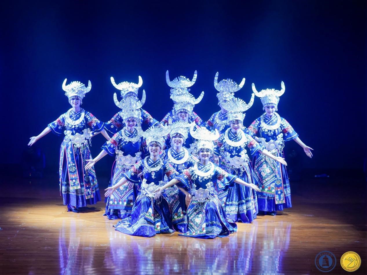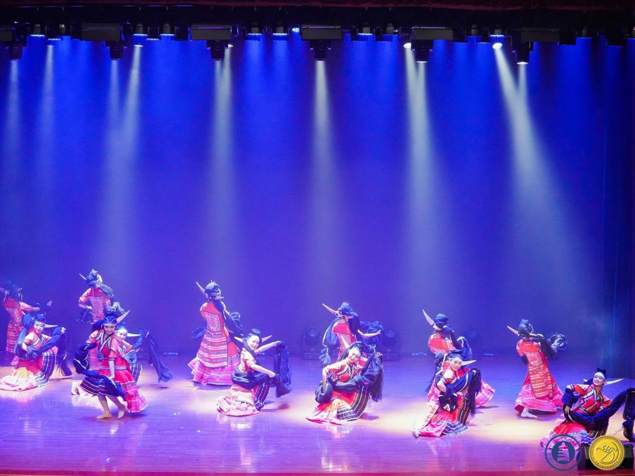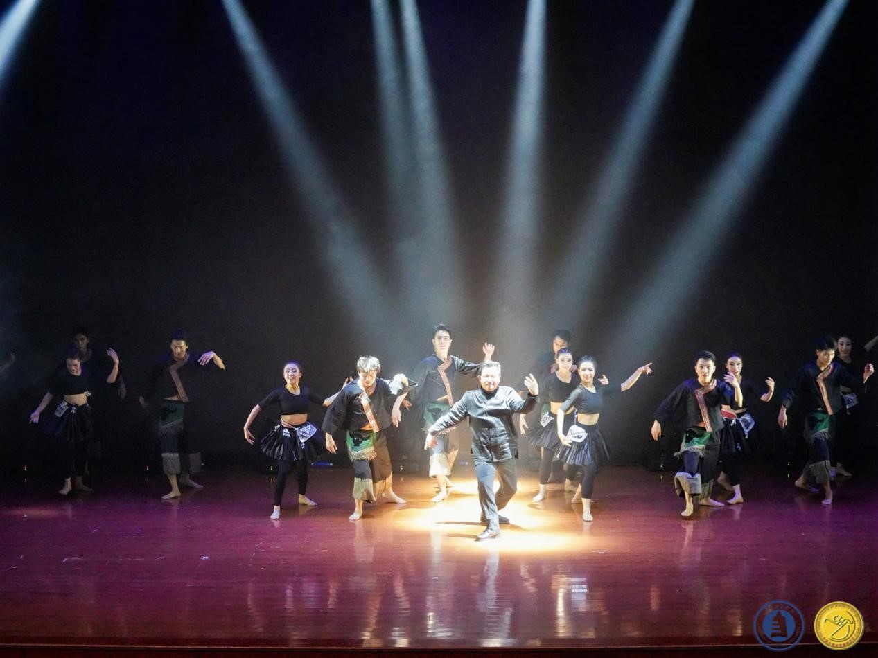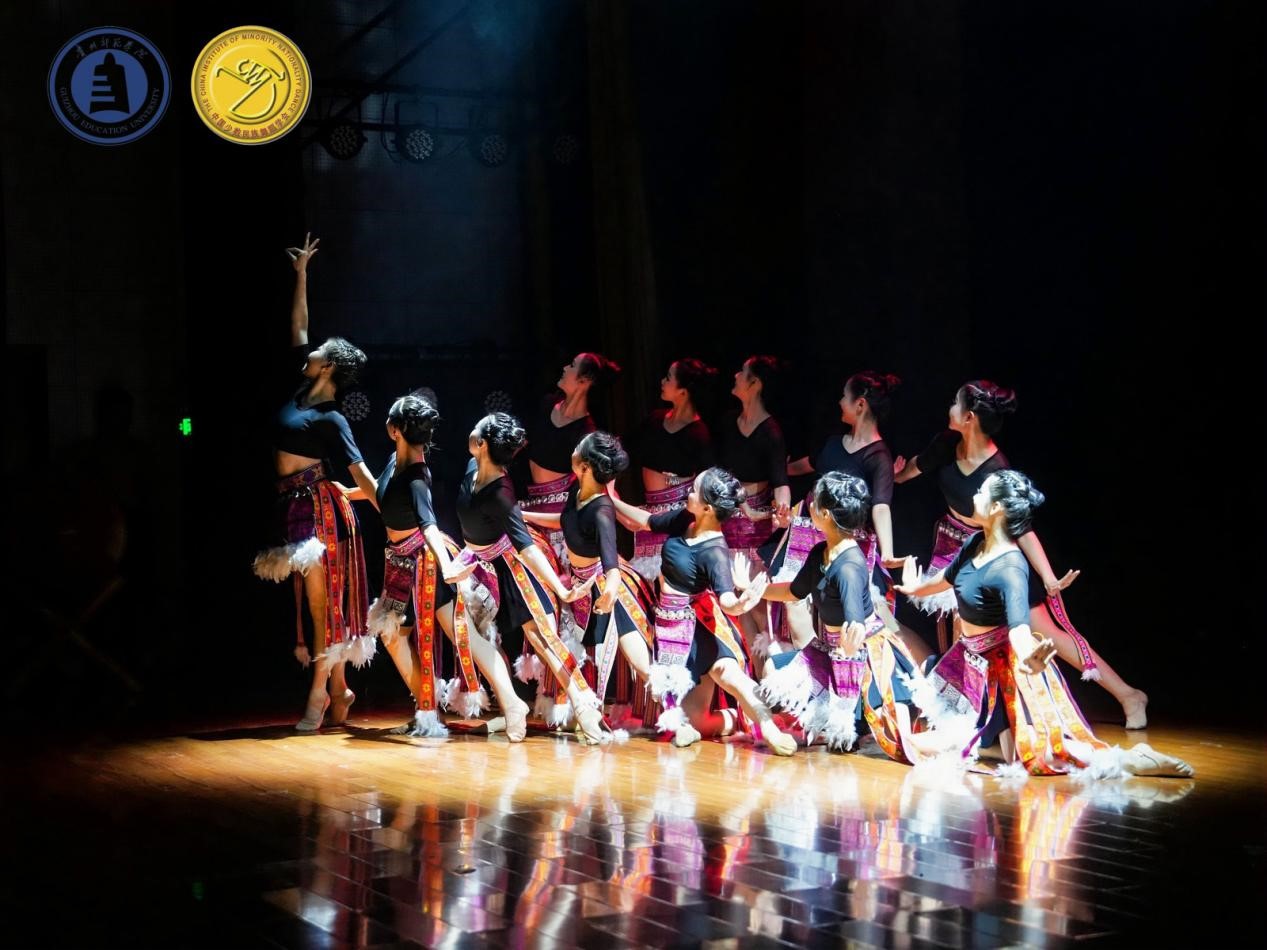 其次,肖伟上台讲话介绍教学成果,成果展分为两个部分:苗族舞蹈板块教学组合展示以及贵州原创剧目展示。首先,呈现的是苗族舞蹈板块教学组合:前曲动律组合(男、女)》《锦鸡舞表演组合(女)》《基本体态与手位训练组合(男)》《综合表演性组合(女)》《芦笙舞组合(男)》,还有传统组合中的《踩鼓(女)》《反排木鼓舞(男、女)》等。同学们凭借矫健的动作、欢快的节奏以及激情澎湃的舞姿,将苗族的民俗风情和精神风貌展现得极为透彻,展示出了苗族对于生活的热爱与向往之情。再次,到贵州原创剧目展示,《五彩姊妹》《贲牛摶角》《梭戛长河》《青春风采》《水西脚印》以及《豆豉粑娶媳妇》等6个优秀原创剧目依次上演。剧目中,《五彩姊妹》展现出苗族少女们身着节日盛装,去追寻属于自己的幸福与美满;《贲牛摶角》意在生动地呈现水族村寨中年轻人的热情奔放与英勇无畏;《梭戛长河》呈现出女性们的长发如瀑布般垂落,她们巧妙地将那油亮的青丝轻柔地盘绕、编织,最终固定在木制的长角上;《青春风采》表现出当代老员工不忘初心,将自己民族的文化传承下去,守正创新,提升民族自信,这便是青春风采赋予当代老员工的使命;《水西脚印》是一个奢香与水西的故事;《豆豉粑娶媳妇》这一作品中,男主角“豆豉粑”在梦中追求幸福婚姻的场景,不但展现了他对美好生活的向往,也映射出当代农村青年积极进取的精神面貌。