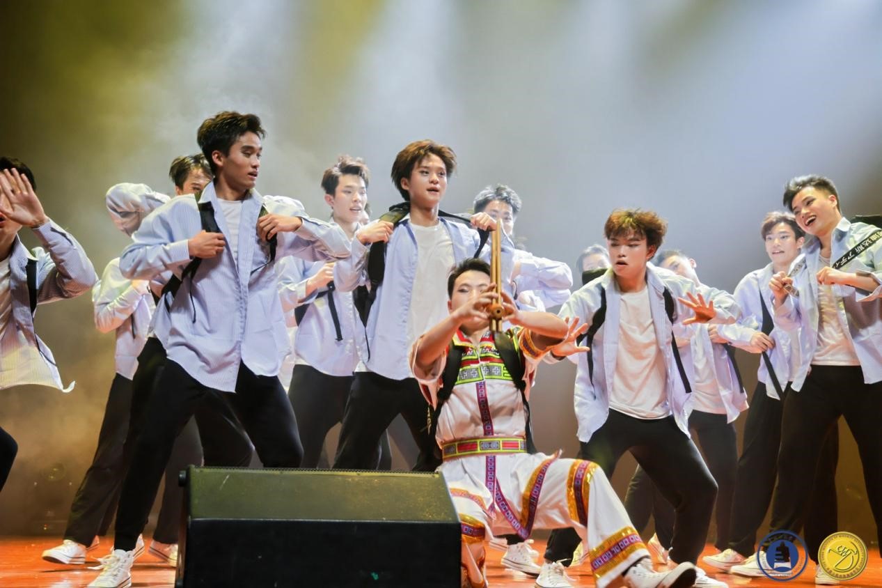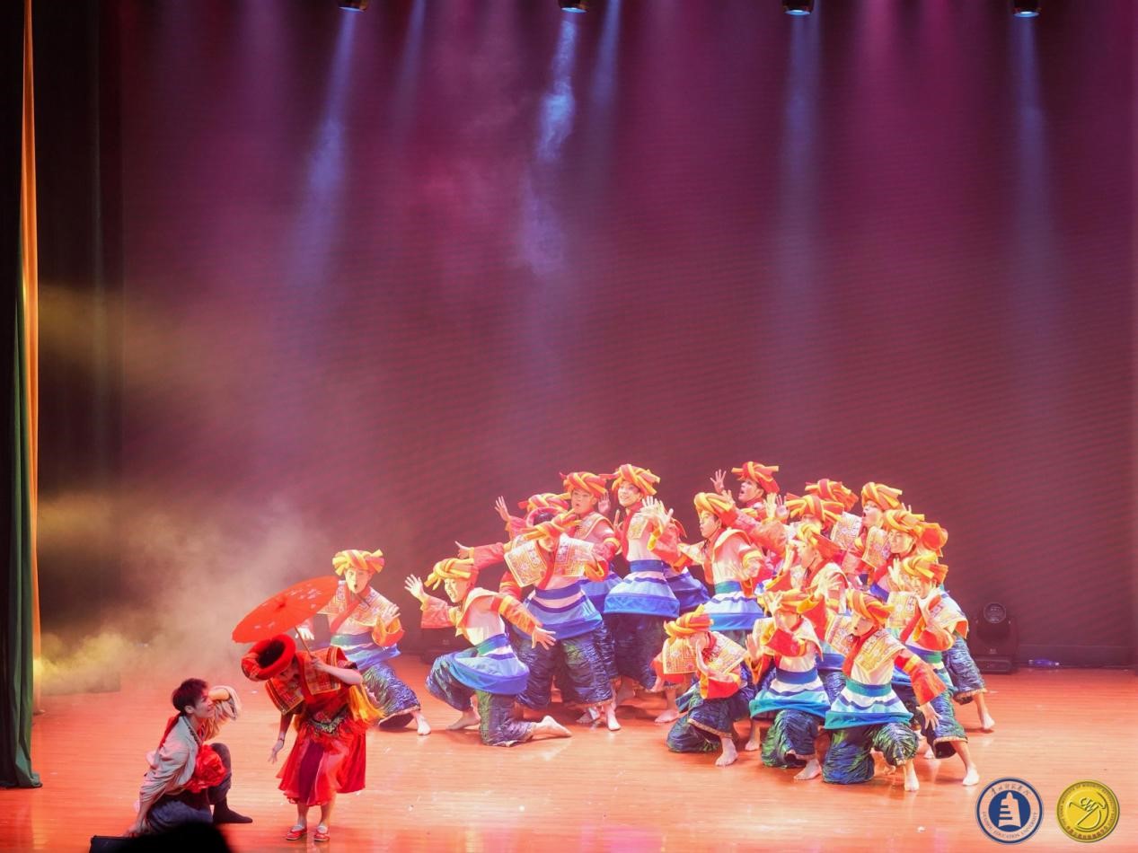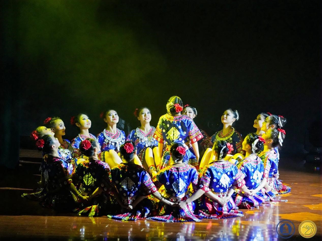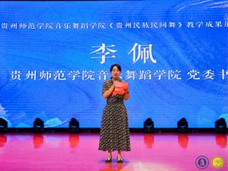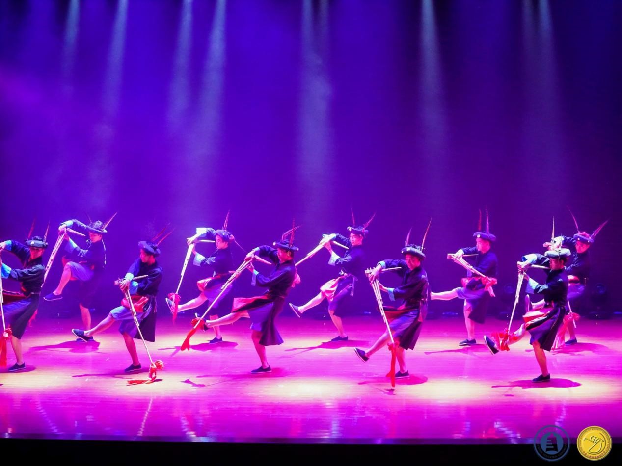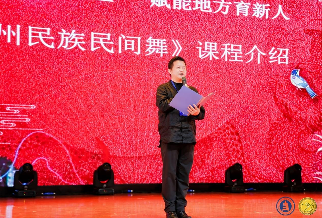 其次,肖伟上台讲话介绍教学成果,成果展分为两个部分:苗族舞蹈板块教学组合展示以及贵州原创剧目展示。首先,呈现的是苗族舞蹈板块教学组合:前曲动律组合(男、女)》《锦鸡舞表演组合(女)》《基本体态与手位训练组合(男)》《综合表演性组合(女)》《芦笙舞组合(男)》,还有传统组合中的《踩鼓(女)》《反排木鼓舞(男、女)》等。同学们凭借矫健的动作、欢快的节奏以及激情澎湃的舞姿,将苗族的民俗风情和精神风貌展现得极为透彻,展示出了苗族对于生活的热爱与向往之情。再次,到贵州原创剧目展示,《五彩姊妹》《贲牛摶角》《梭戛长河》《青春风采》《水西脚印》以及《豆豉粑娶媳妇》等6个优秀原创剧目依次上演。剧目中,《五彩姊妹》展现出苗族少女们身着节日盛装,去追寻属于自己的幸福与美满;《贲牛摶角》意在生动地呈现水族村寨中年轻人的热情奔放与英勇无畏;《梭戛长河》呈现出女性们的长发如瀑布般垂落,她们巧妙地将那油亮的青丝轻柔地盘绕、编织,最终固定在木制的长角上;《青春风采》表现出当代老员工不忘初心,将自己民族的文化传承下去,守正创新,提升民族自信,这便是青春风采赋予当代老员工的使命;《水西脚印》是一个奢香与水西的故事;《豆豉粑娶媳妇》这一作品中,男主角“豆豉粑”在梦中追求幸福婚姻的场景,不但展现了他对美好生活的向往,也映射出当代农村青年积极进取的精神面貌。
