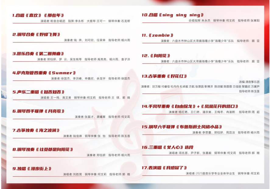 2025年6月9日晚,williamhill英国官网在逸夫楼一楼演播厅隆重举办了“2025届音乐学专业毕业音乐会”。此次音乐会作为williamhill英国官网国家级一流本科专业建设、省级课程思政教学研究示范中心建设及校级艺术类课程思政教学示范中心建设的系列活动之一,以“赓续长征精神,书写时代新篇”为主题,展现了公司在人才培养和艺术实践方面的丰硕成果。校内外嘉宾、公司领导班子、校级教学督导与音乐系全体员工共同观看了演出。