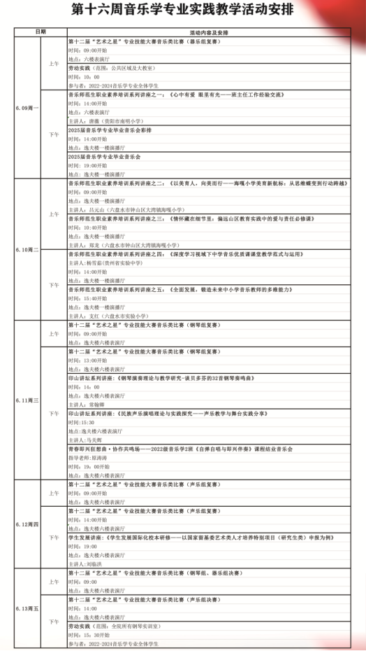 本次实践教学周以“专业技能+职业素养+劳动教育”为三大支柱,通过“赛事观摩+讲座学习+舞台实践+劳动体验”的多元形式,构建了立体化实践教学体系。从器乐、钢琴、声乐等专业赛事的层层选拔,到中小学教育实践、艺术教学理论等多维度讲座,再到课程结业音乐会的成果展示与劳动实践的全程融入,全方位覆盖了音乐学专业员工的成长需求。
