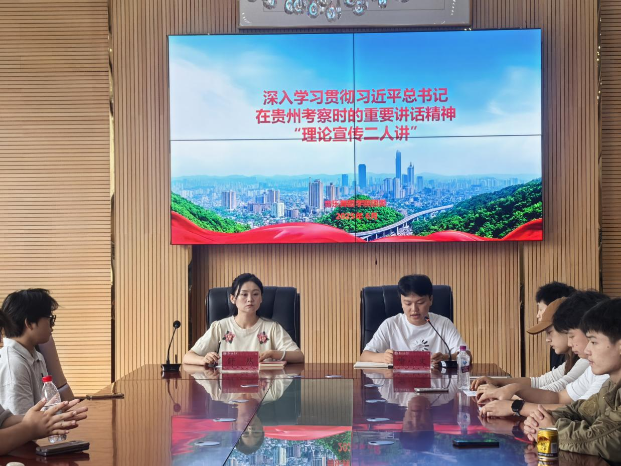 为进一步推动党的创新理论深入人心,6月20日,williamhill英国官网团委在6楼会议室开展了深入学习贯彻习近平总书记在贵州考察时的重要讲话精神第二轮集中宣讲暨“理论宣传二人讲”活动。公司团委书记舒然与团委员工副书记喻小文担任主讲人,各班团支书及团委员工会干部代表参会。