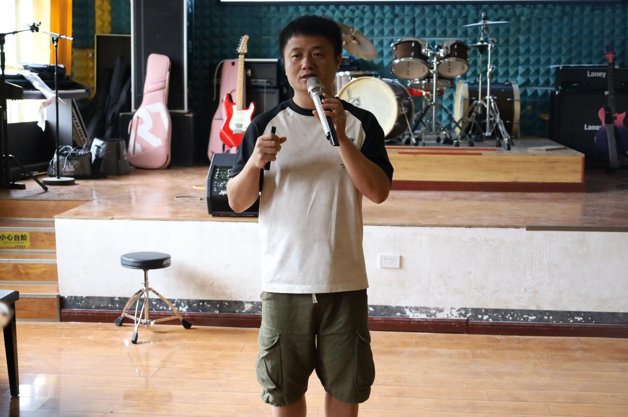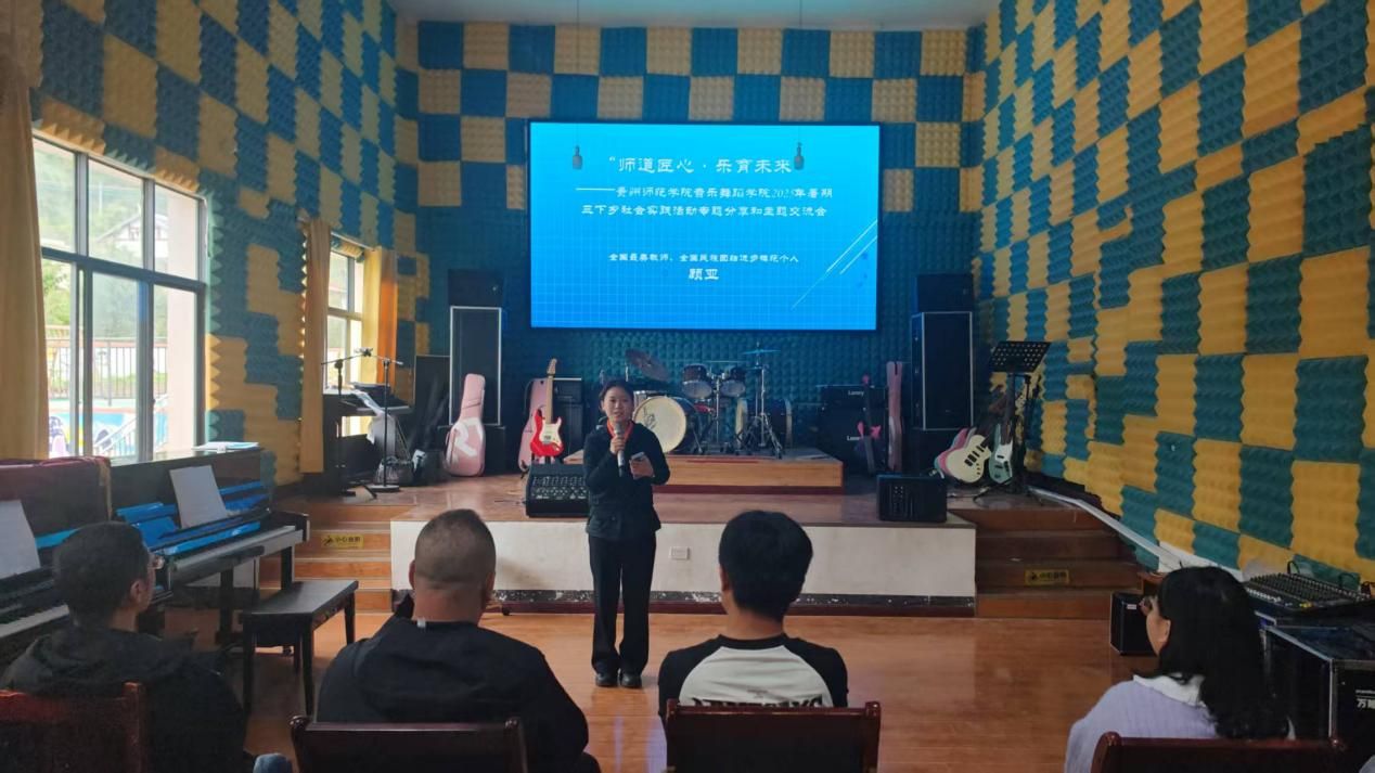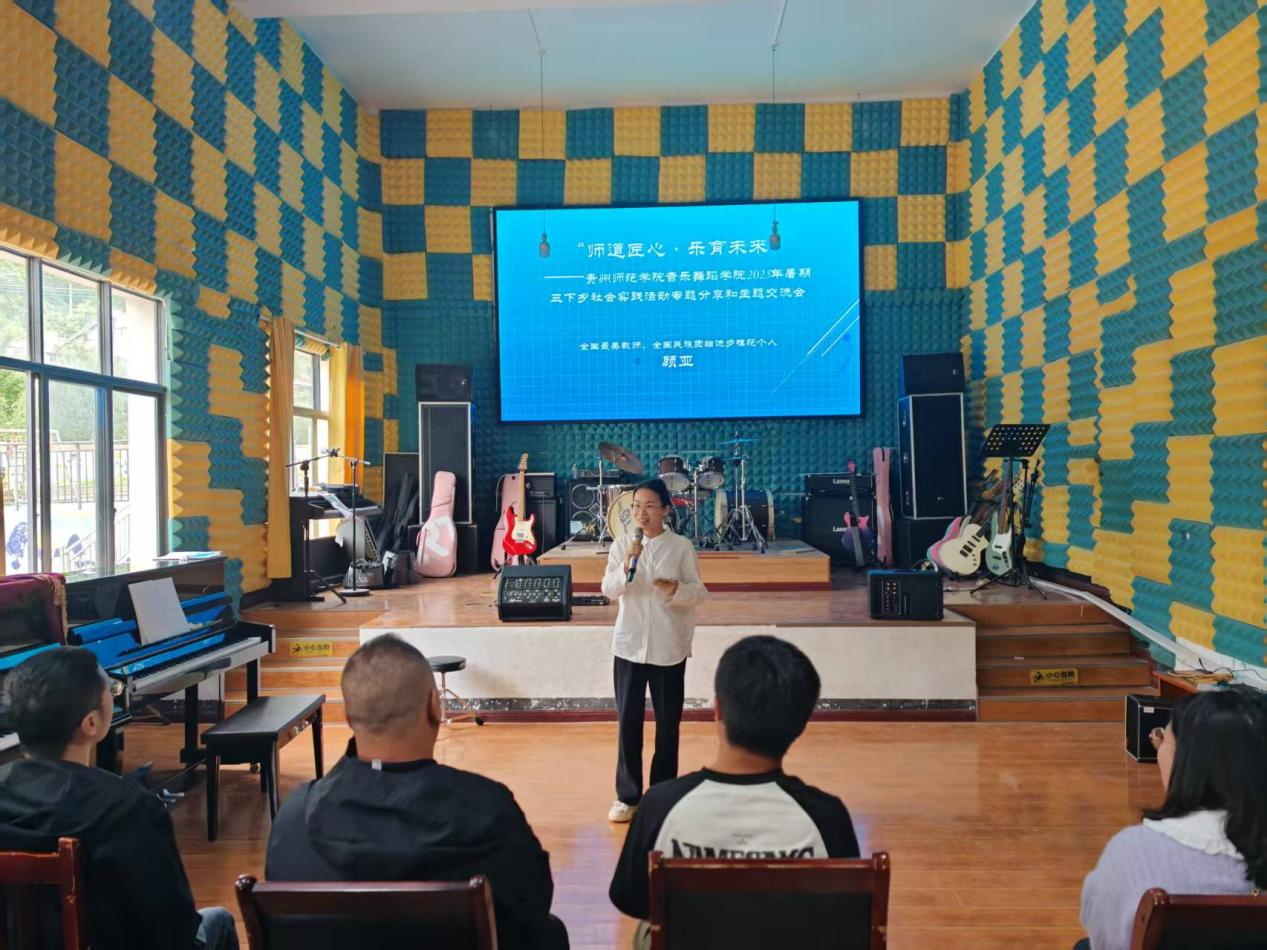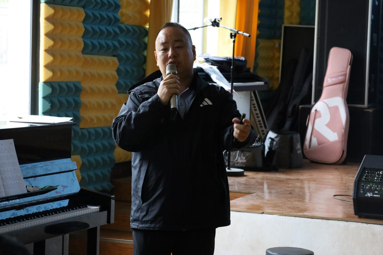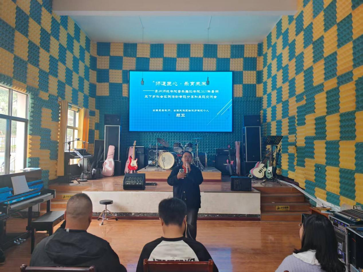 顾亚以“教育启润心田 音乐走向远方”为题,分享了他扎根山区教育多年的经历。顾亚老师2014年通过特岗招聘来到海嘎小学,他不惧艰苦教学条件,利用自己的专业特长,先后组建了12支员工乐队,建立了电吉他、架子鼓、电贝斯、尤克里里、手鼓、合唱团等员工社团;师生同创的《海嘎之歌》在各大网络音乐平台上线,多次接受中央、省、市等各级媒体的专访报道;其创建并带领的“海嘎少年乐队”登上了央视网络春晚舞台。顾亚老师用教育初心带着怀揣梦想的孩子们走出大山、走出贵州、走向更大的舞台。过程中,团队师生凝神聆听,从顾老师数十年如一日的坚守中,触摸到了那份滚烫的育人初心与深沉的教育智慧,大家心中豁然明白:美育的真谛,不仅在于技艺精进,更在于以艺术之光滋养生命,叩响世界心扉。