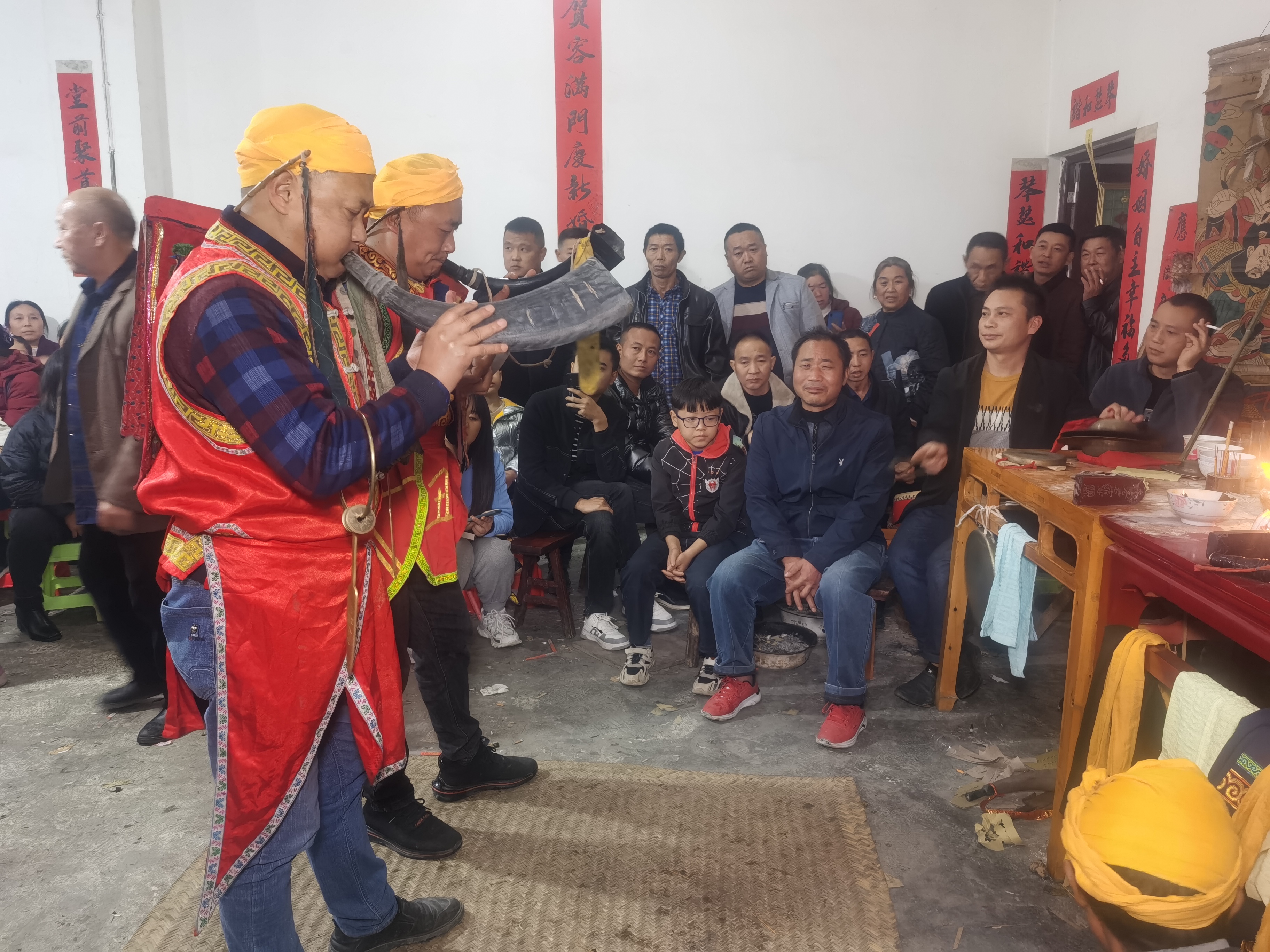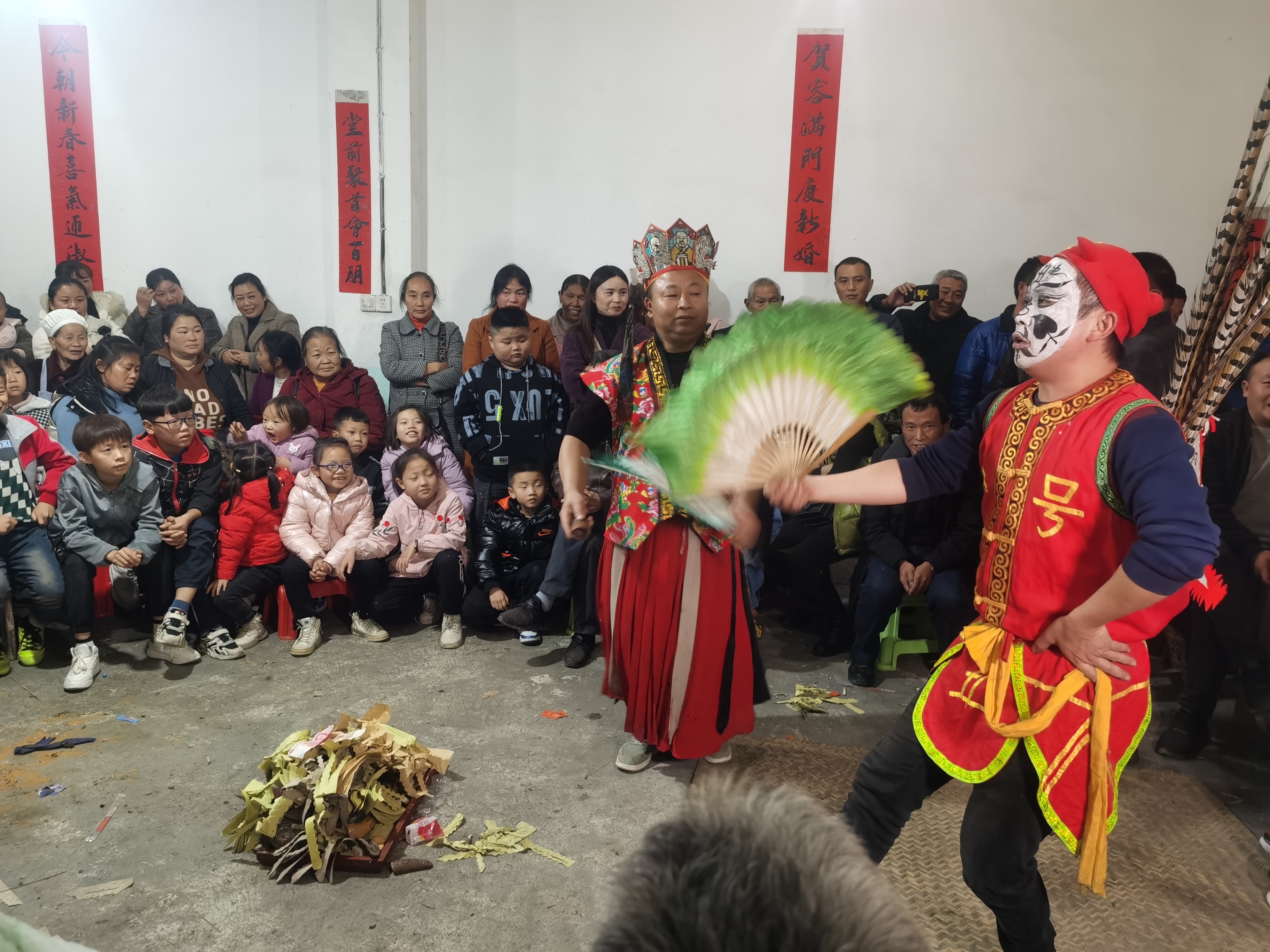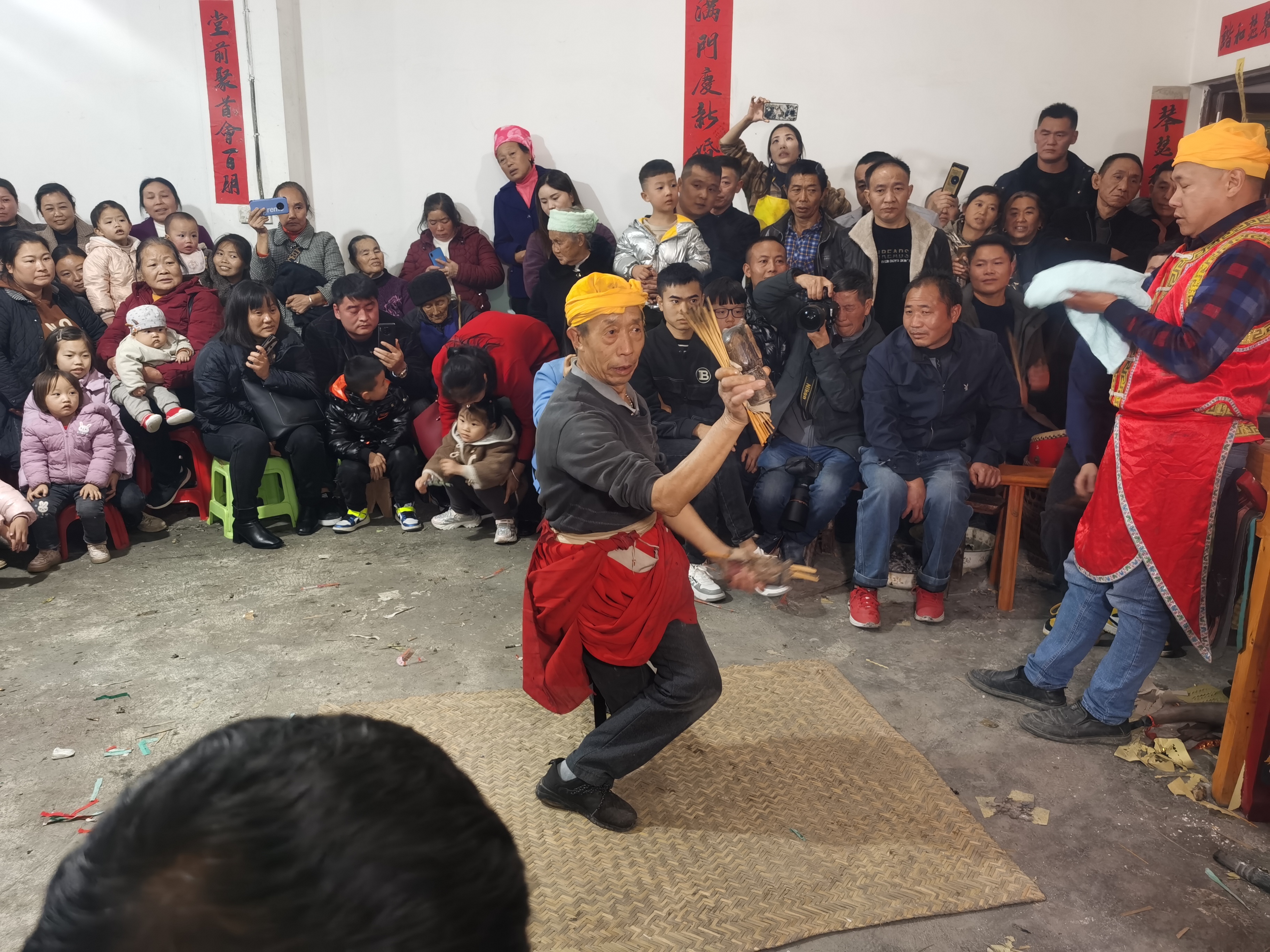 本场仪式属“傩堂戏”中的“杠神”,在铜仁市德江县稳坪镇安氏家族的堂屋中举行,旨在为安氏子孙驱瘟逐疫、祈福纳祥。整个仪式从13日上午11时开始,直至14日中午12时结束,以请神、酬神、送神为主要环节内容,将歌、舞、乐、剧四位一体的音声环境贯穿其中,祭祀与音乐、正戏与插戏配合得天衣无缝,具有强烈的民族音乐学、音乐史学研究气息,为音乐理论研究提供了宝贵的田野材料。