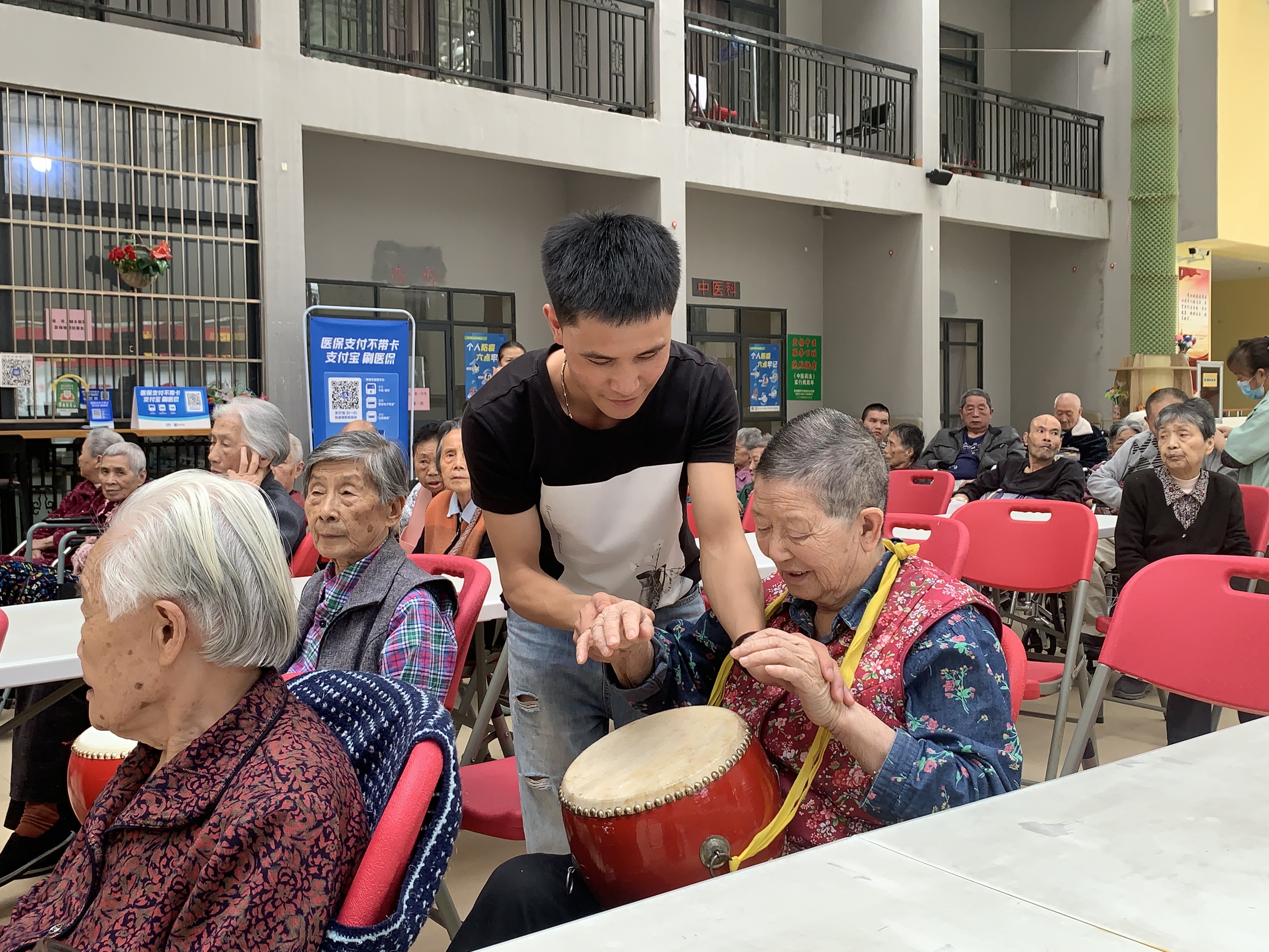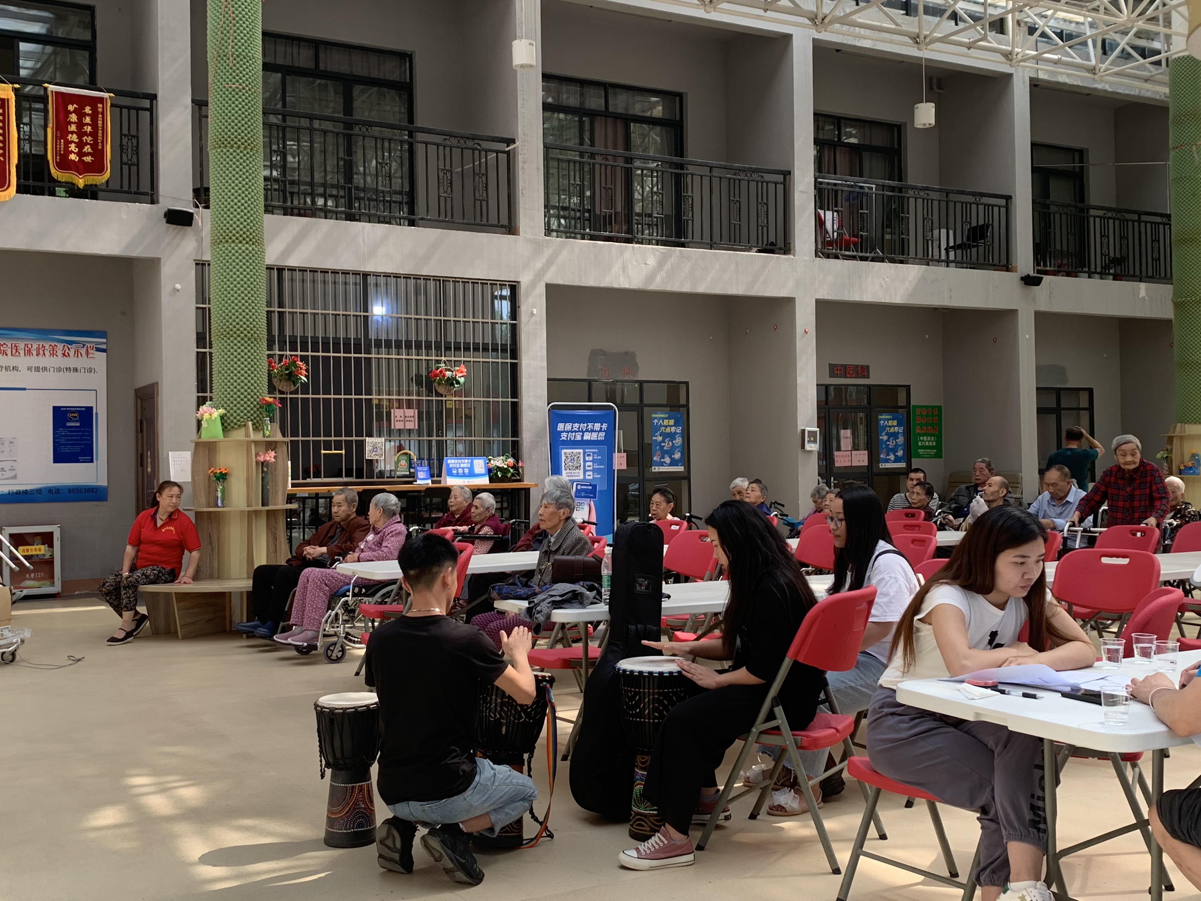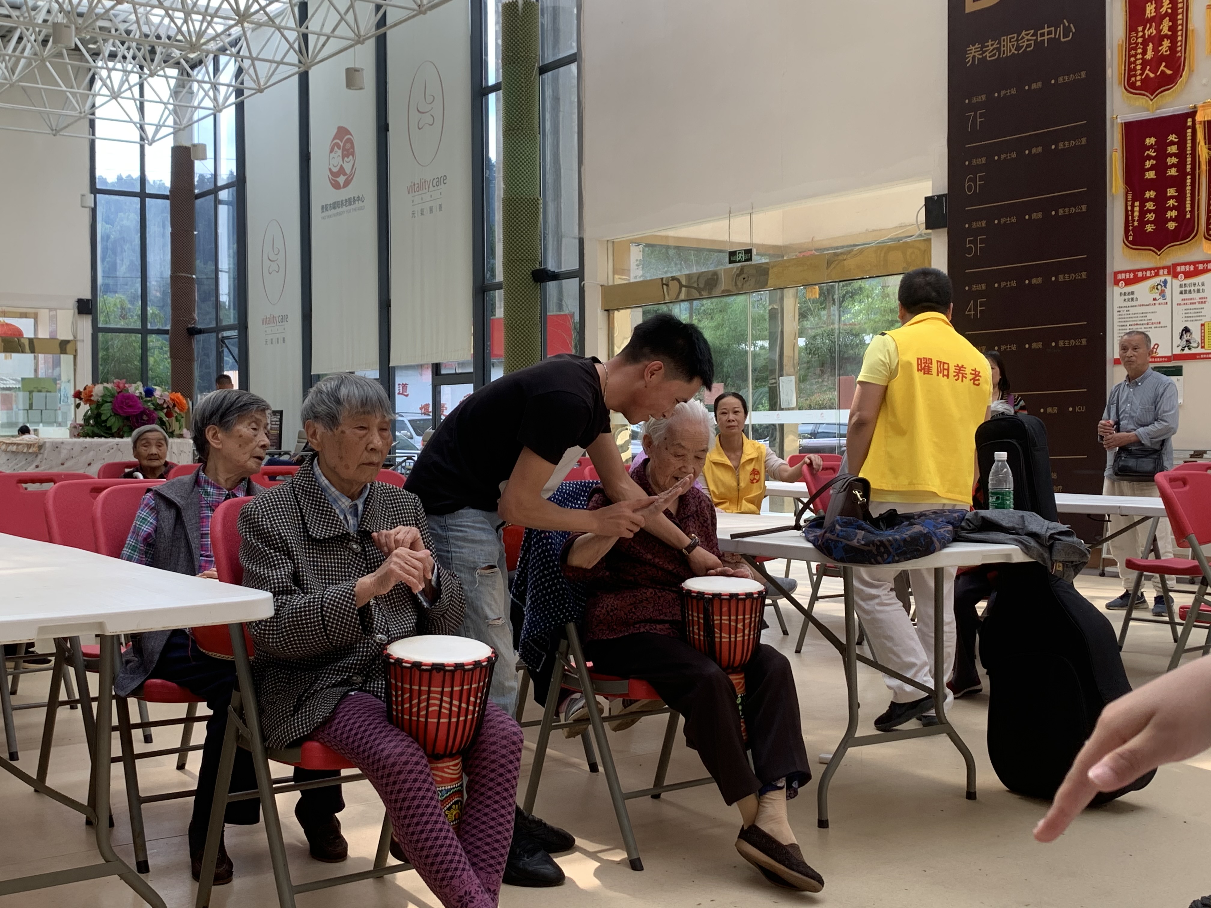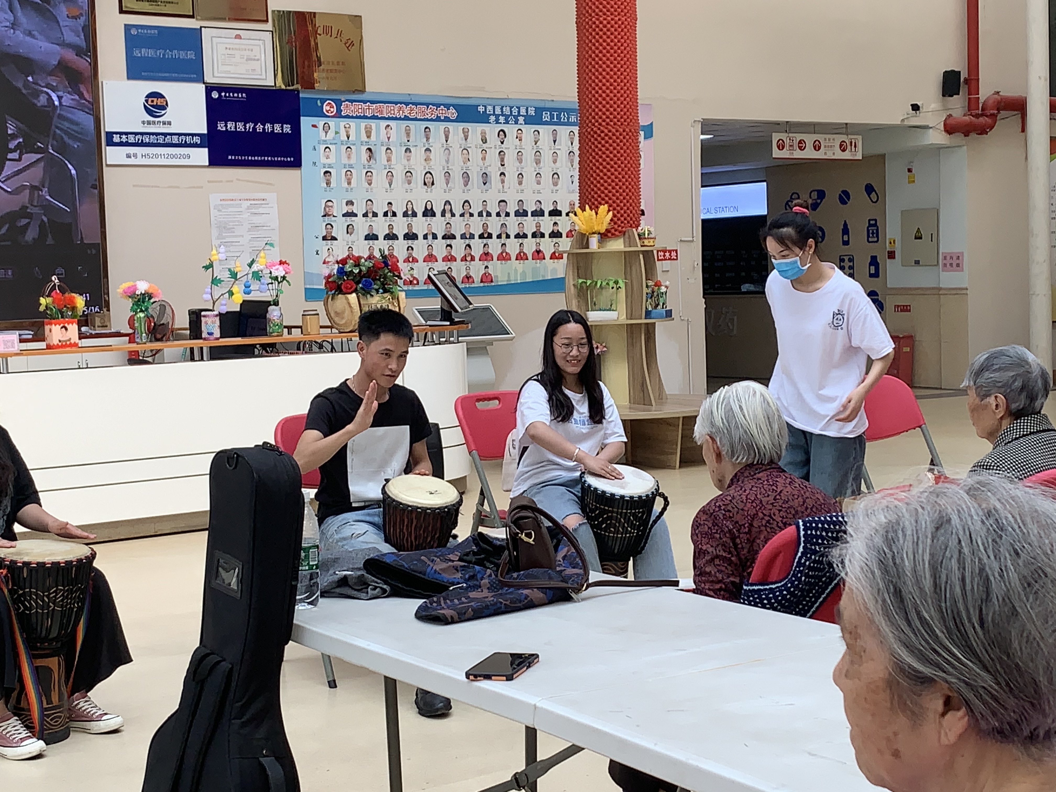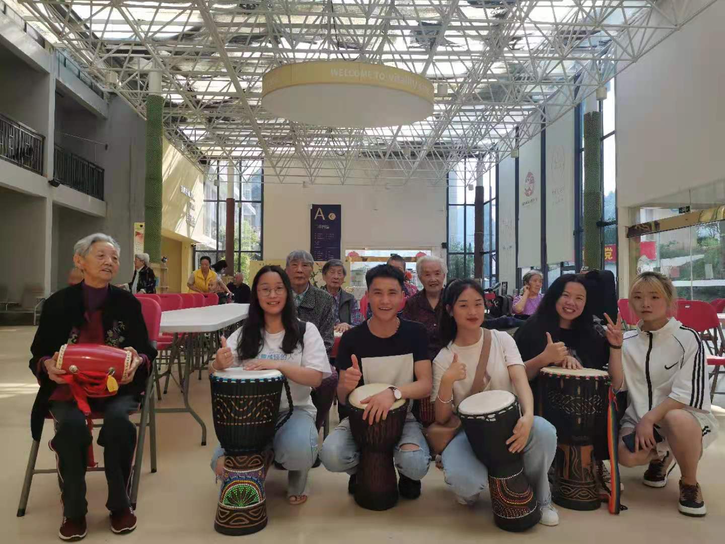根据课程安排,此次的教学内容为非洲鼓教学。参加本次教学授课的是williamhill英国官网2020级音乐学二班孔德伟、赵西平、赵美辉、 张瑶荔、朱丹丹同学。活动初始,敬老院为各位老人初次提供了人手一个非洲鼓的原因,现场气氛活跃。首先孔德伟同学为老人们带来了一首用非洲鼓演奏的乐曲示范。随后,张瑶荔、赵西平、赵美辉、朱丹丹几位小老师一个动作一个节拍的教老人们进行学习这个首乐曲。紧接着,孔德伟带领大家又练习了一遍今天教的动作和节拍,并进行合奏。活动最后小老师们为老人们讲述了一些打非洲鼓的技巧运用,同学和老人们在其乐融融的课堂里结束了本节课程。