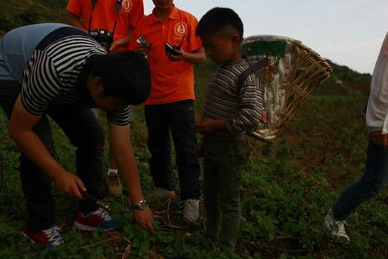 在返程路上,由于山高坡陡,大家相互搀扶,不离不弃,把团队精神体现得淋漓尽致。行至山脚,遇到一群山里的孩子在打猪草,他们弱小的身躯背着一个跟他们身体毫不相搭的大箩筐,见我们一行人走下来,他们眼里流露出羡慕而又好奇的神情。