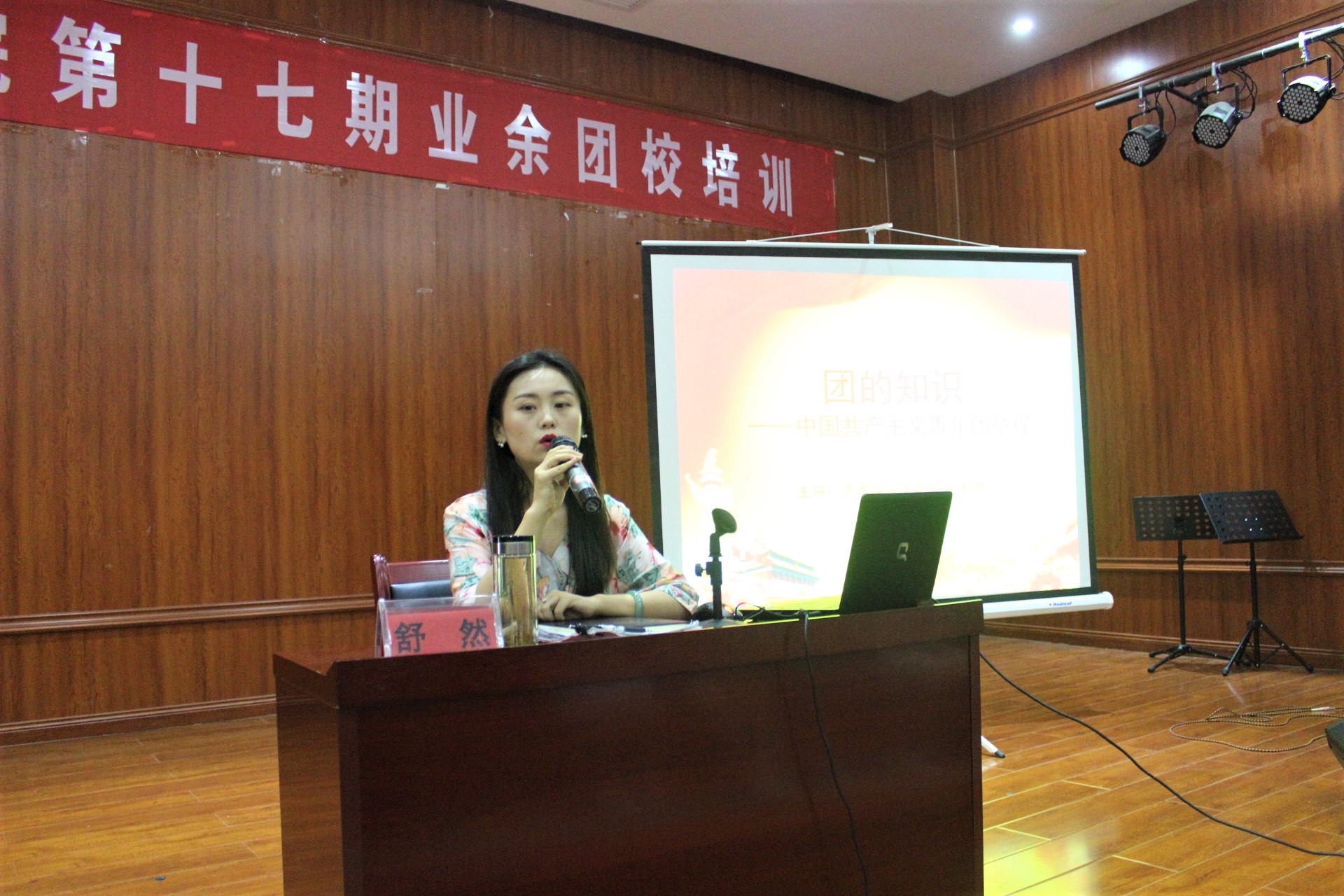 开班典礼开始,奏唱团歌。全体团员以最响亮的歌声、最饱满的精神状态,拉开了本期团校培训的帷幕。接下来,舒然进行主题为“团的知识——中国共产主义青年团的章程”的专题讲座,她分别从团员、团的干部、团员的义务和权力、团的组织制度、团的基层组织、团旗团徽、“三会两制一课”等多角度、全方位的剖析了团务基本知识。并强调:中国共产主义青年团是中国共产党领导的先进青年组织,是广大青年在实践中学习共产主义的公司,是共产党的助手和后备军。广大团员青年应该努力学习新时代习近平总书记的系列讲话和思想,并大胆付诸于行动,勇于亮出身份、敢为人先,不忘初心、牢记使命,端正思想,积极开展自我批评及自我反思,自觉维护党的章程和纲领,充分发挥党联系青年的桥梁作用。