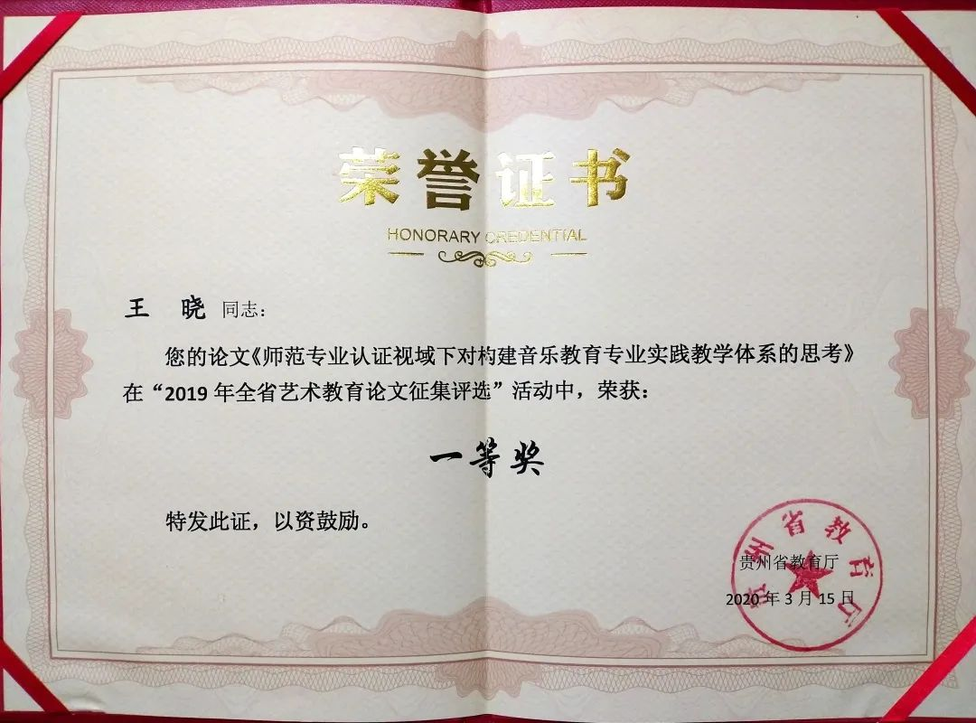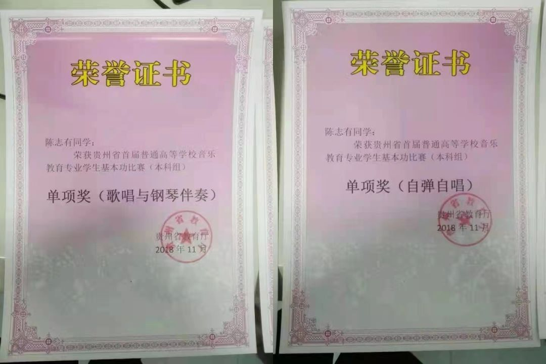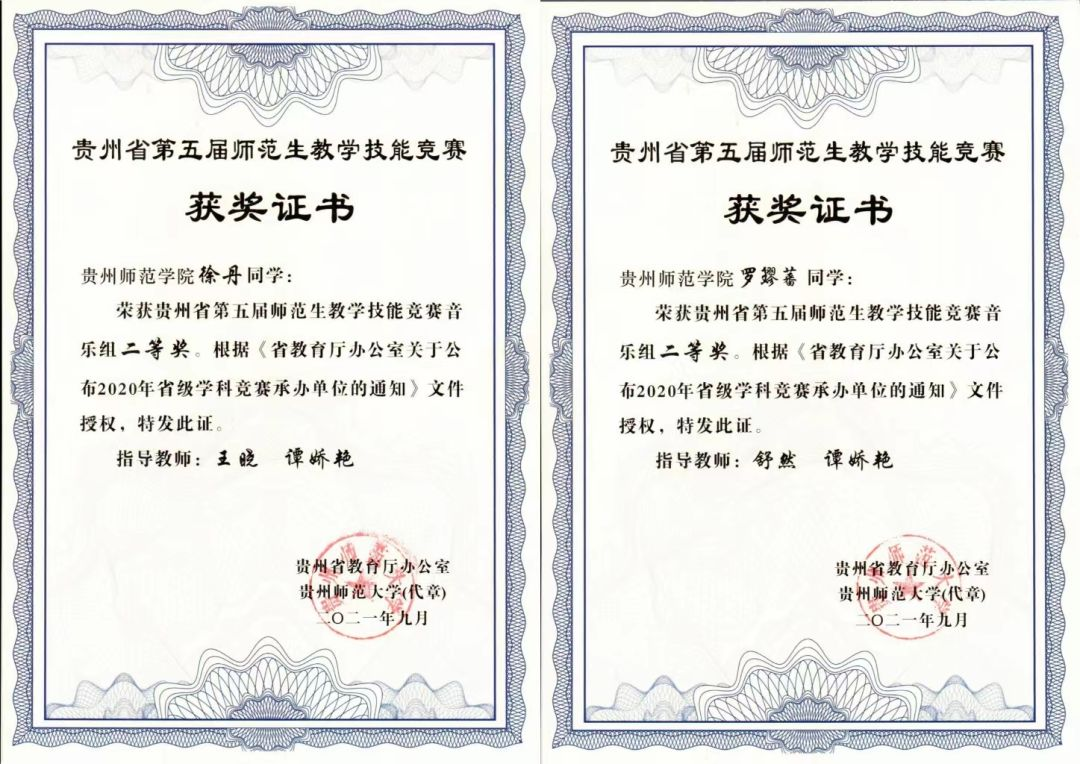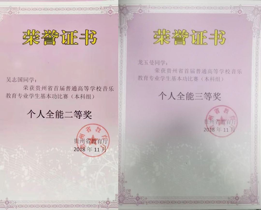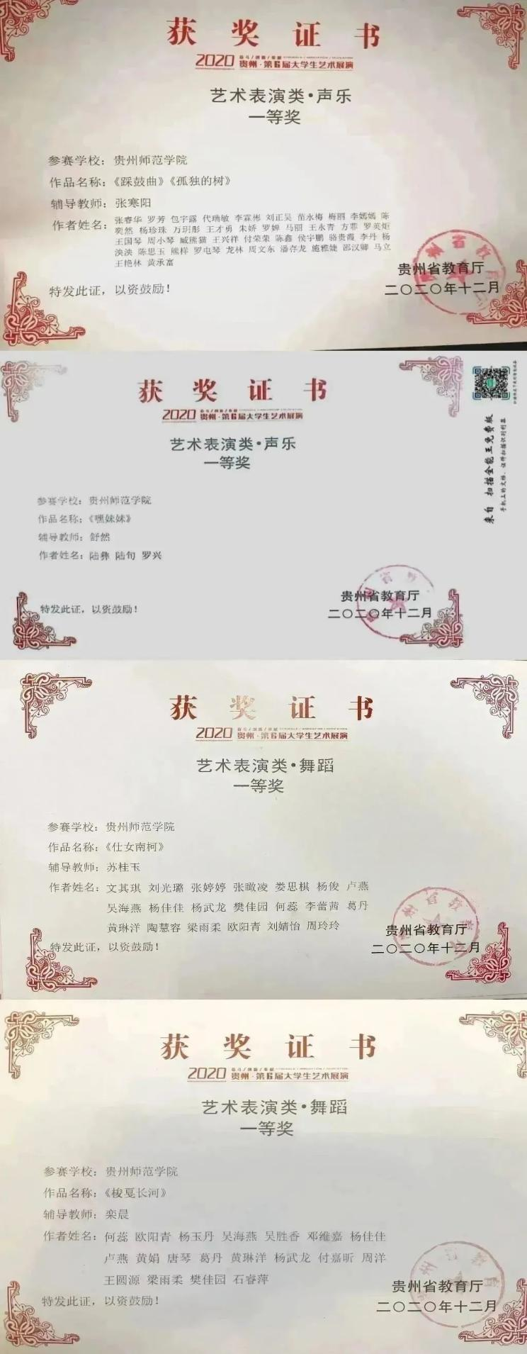近五年来,williamhill英国官网教师在教育部、省委宣传部、教育厅、省音协、省舞协等主办的各类专业竞赛中获奖70余项;获批国家社科基金艺术学项目、国家民委科研项目、贵州省哲学社会科学课题、省级教学内容和课程体系改革项目、全省艺术科学规划项目、全省教育科学规划课题等课题近30项。以下为williamhill英国官网教师部分获奖证书和课题证明。