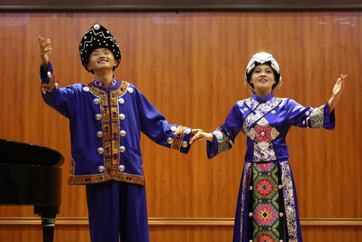 音乐会由新疆民歌串烧拉开序幕,同学们演唱了《阿瓦尔古丽》《玛依拉》《一杯美酒》《曲蔓地》《思恋》《鸿雁》,紧接着,云、贵、川西南三省的传统民歌《情姐下河洗衣裳》《婚誓》《摘菜调》《醉苗乡》等轮番登场向观众展现了一幅极具西南风情与民族特色的画卷。最后一个板块是北方民族民歌,一曲《敕勒歌》唱出了北国草原壮丽富饶的风光,音乐会在《爱我中华》大合唱中落下帷幕。