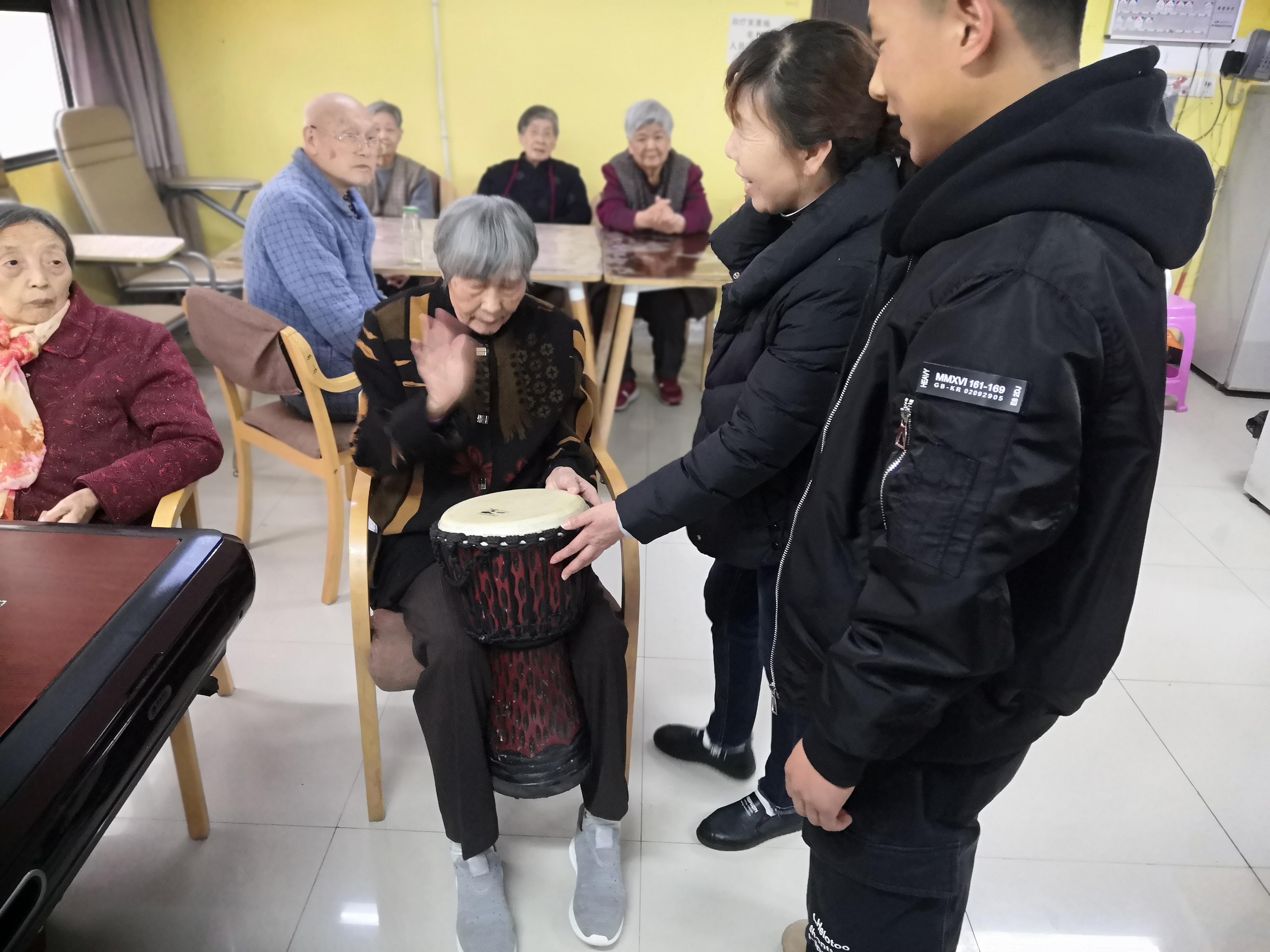第二日下午,“炫美阳光”根据约定时间提前到达了养老院,本次教学课程为“非洲鼓”乐器教学,授课人是2019级音乐学一班的陆彝。面对“非洲鼓”这一源于非州地区的打击乐器各位老人充满了好奇。课程开始陆彝首先介绍“非洲鼓”来历及基本敲击方法,随后便开始了课程教学。今日气温骤降,但老人们的参与度和积极性依然很高,在课程教学中老人们挨个体验了“非洲鼓”敲击音色。在同学的带领下共同学习了《我和我的祖国》等歌曲的敲击。最后在一片欢声笑语结束本次课程。